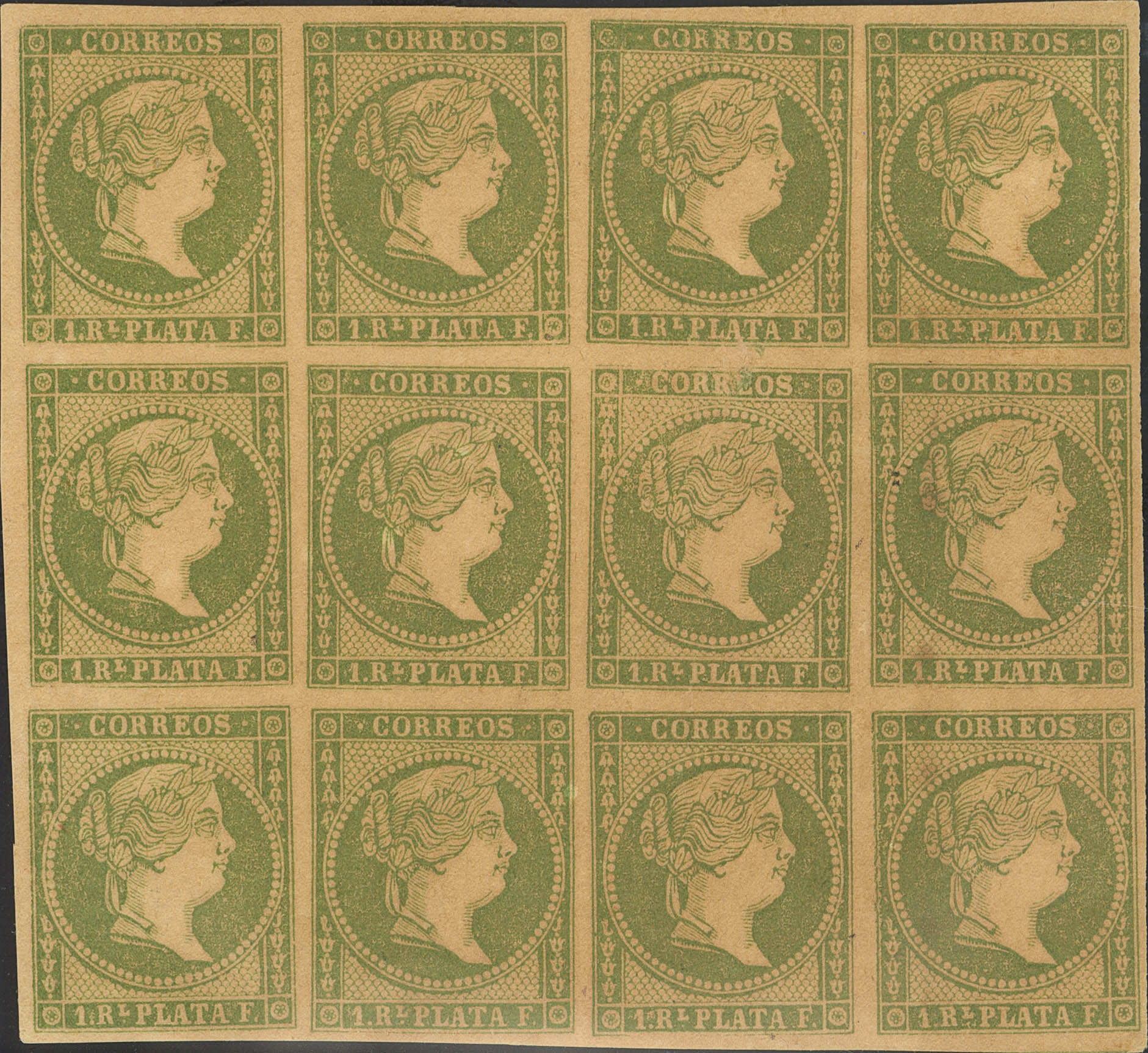 (★) Ant.8A(12). 1862. 1 real verde, bloque de doce. PLANCHA LIMPIADA CON ACIDO. MAGNIFICO. Edifil 2019: +++144 Euros