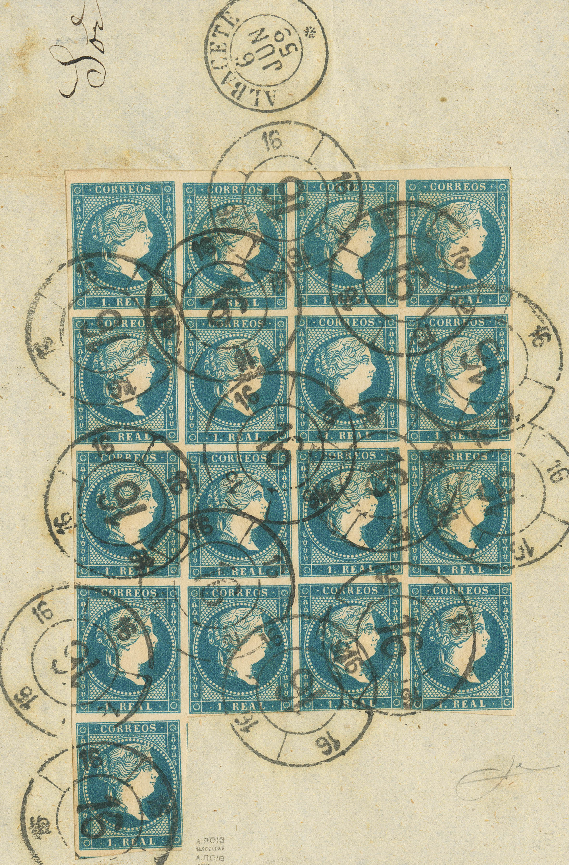 △ 49(17). 1859. 1 real blue, block of seventeen stamps, on fragment. Postmark R.CARRETA Nº16, from Albacete. MAGNIFICENT AND PIECE OF ENORMOUS SPECTACULARITY AND RARITY. Cert. GRAUS.
