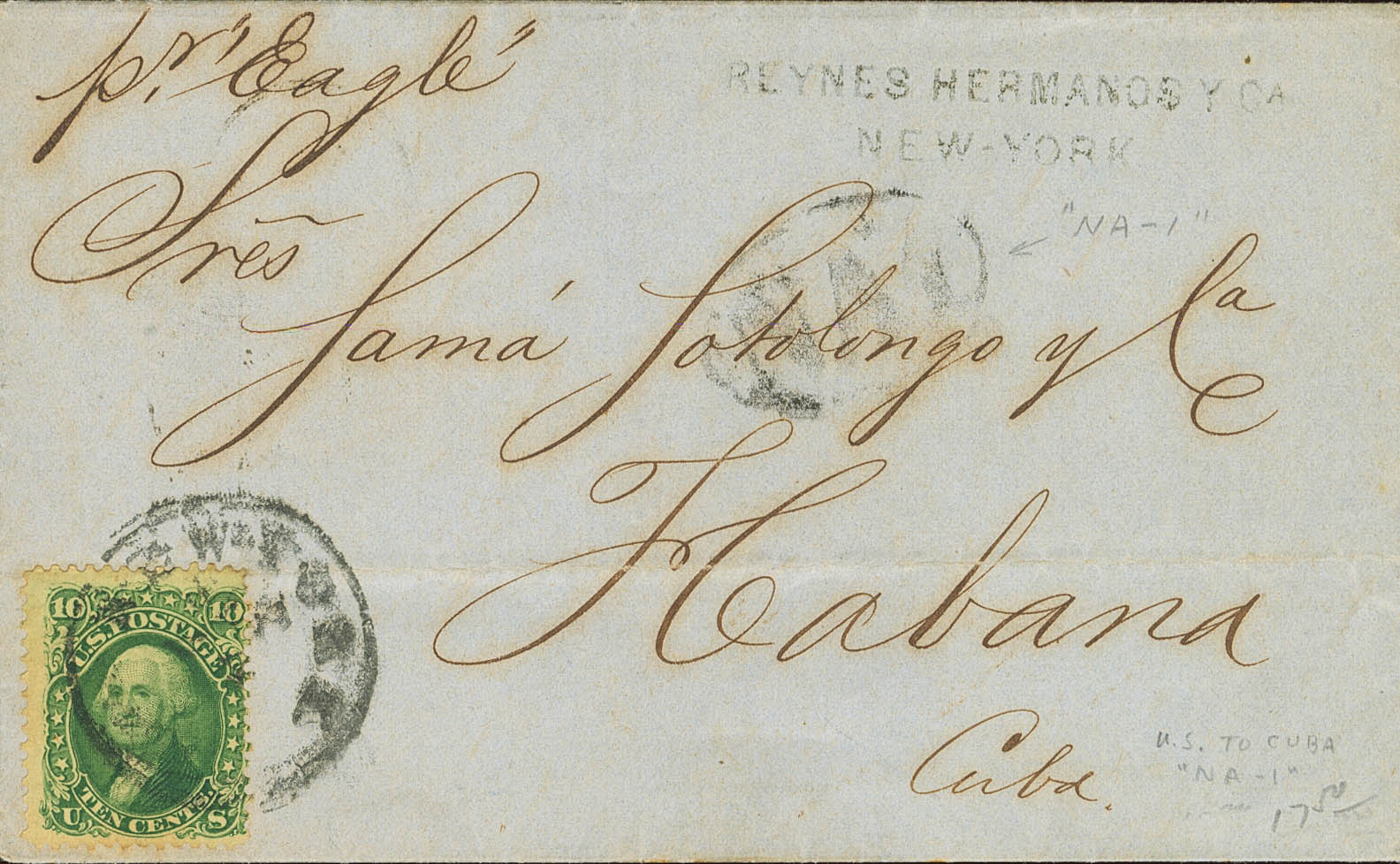 1863. 10 ctvos verde. NUEVA YORK (ESTADOS UNIDOS) a LA HABANA (CUBA). En el frente marca NA-1, en negro. MAGNIFICA.