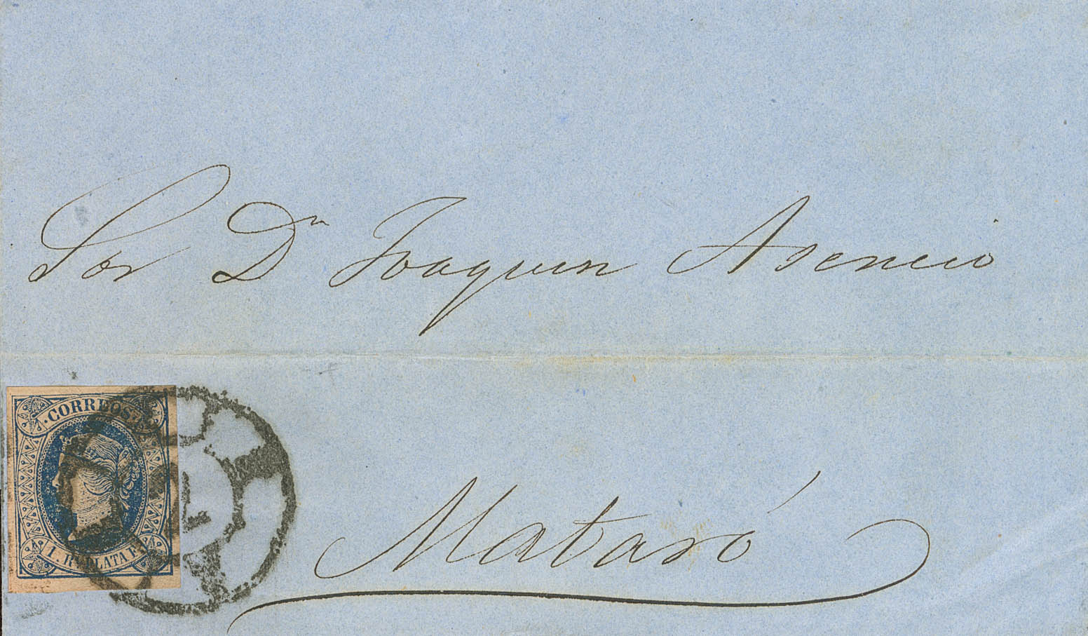 Ant.11. 1864. 1 real blue. HAVANA (CUBA) to MATARO (BARCELONA). Postmark R.CARRETA Nº2, applied upon arrival. MAGNIFICENT AND SPECTACULAR.