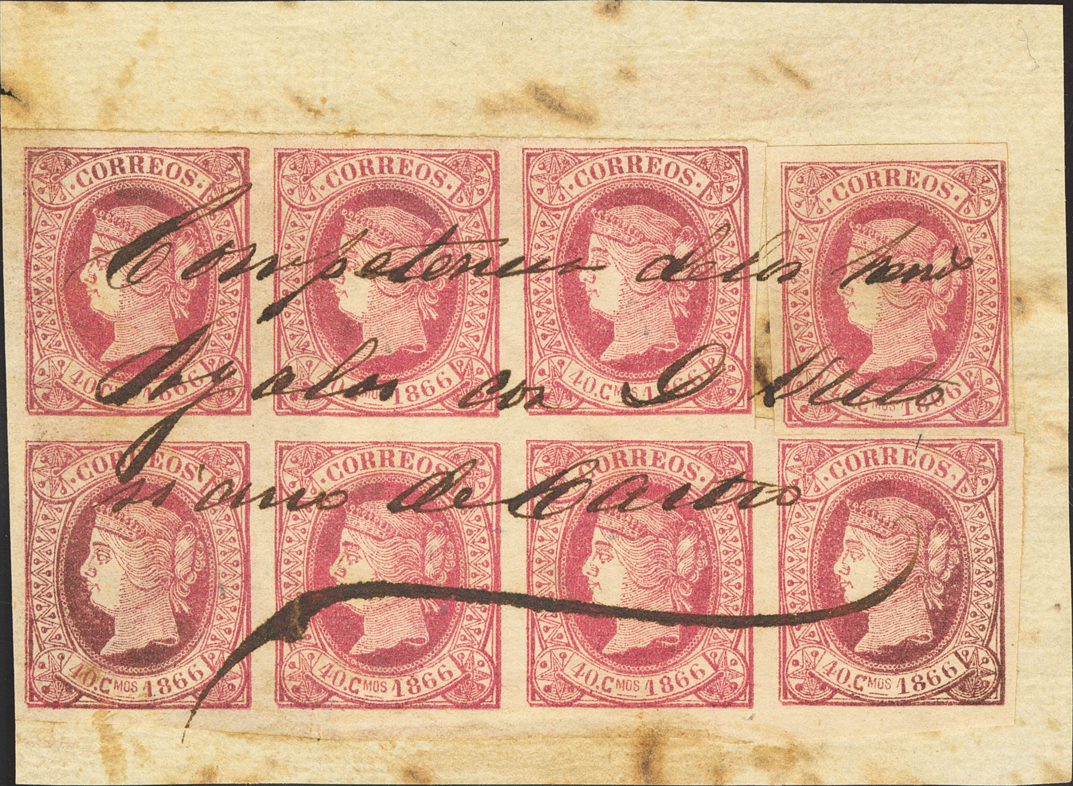 16(8). 1866. 40 cts rose, block of seven and a seal, on fragment. Handwritten postmark "Competition of the Mand´". MAGNIFICENT.