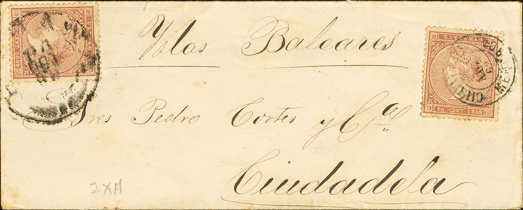 Ant.16(2). 1869. 10 cts chestnut, two stamps. HAVANA (CUBA) to CITADEL (BALEARIC ISLANDS). MAGNIFICENT AND RARE, WITH EXCESS POSTAGE OF 10 CTS SO IT IS NOT UNUSEABLE ON DEPARTURE AND IT IS ON ARRIVAL AT DESTINATION WHEN IT IS POSTMARKED, A PIECE OF GREAT SPECTACULARITY AND POSSIBLY THE ONLY ONLY KNOWN PIECE.