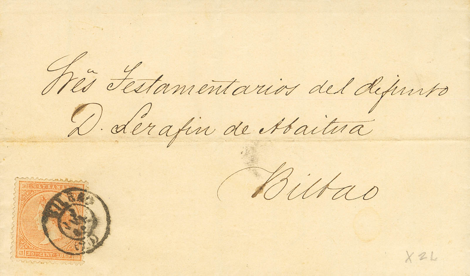 Ant.17. 1869. 20 cts orange. HAVANA (CUBA) to BILBAO. Postmark BILBAO / (20), applied upon arrival. MAGNIFICENT AND VERY RARE CANCELED AT DESTINATION.