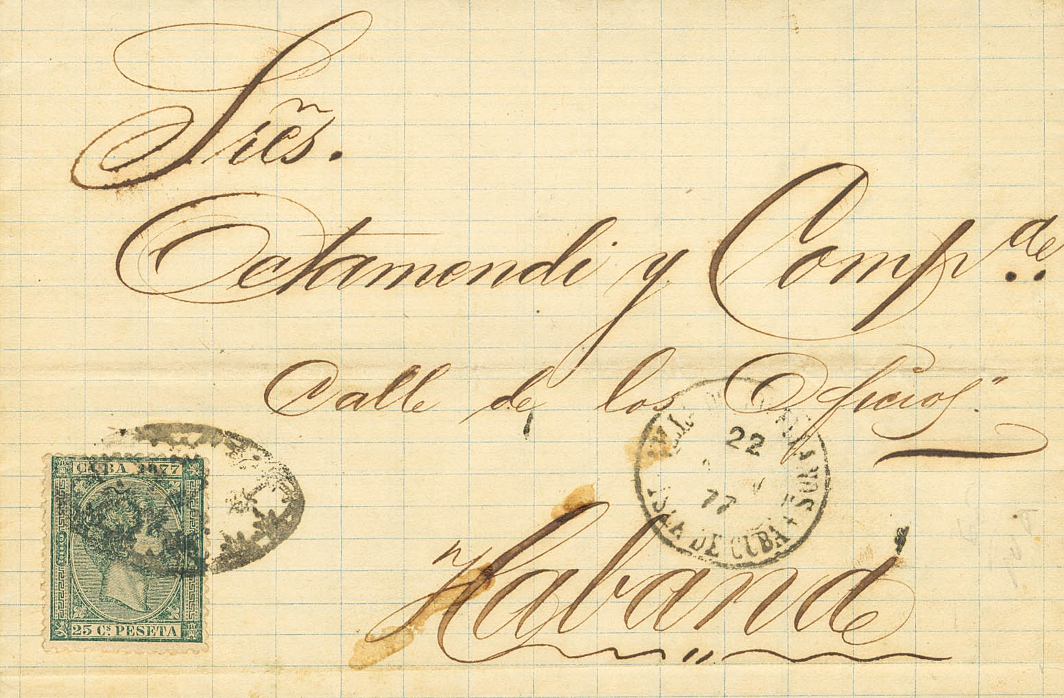 41. 1877. 25 cts verde. VILLA DE JOVELLANOS (CUBA, también llamado "Aurora") a LA HABANA (CUBA). En el frente VILLA DE JOVELLANOS / ISLA DE CUBA. MAGNIFICA Y RARISIMA.
