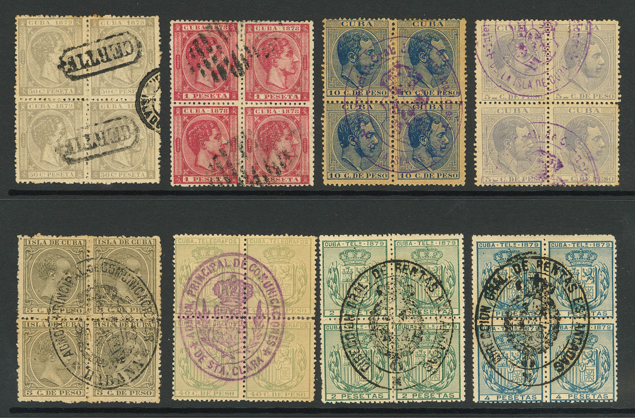 (1879ca). Conjunto de bloques de cuatro de diferentes emisiones, todos ellos inutilizados con matasellos especiales. MAGNIFICO.