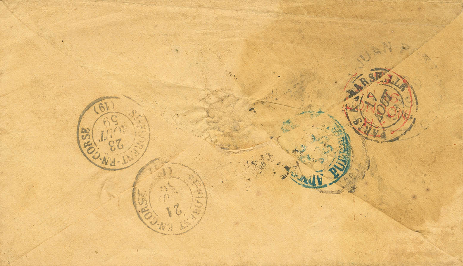 Ant.7. 1859. ½ blue real . SALINAS (PUERTO RICO) to NONZA (FRANCE). PARRILLA postmark, in blue. MAGNIFICENT AND RARE, THE IMMENSE MAJORITY OF LETTERS CIRCULATED TO EUROPE WITH THIS ISSUE DO SO FROM THE CAPITAL OF THE ISLAND.