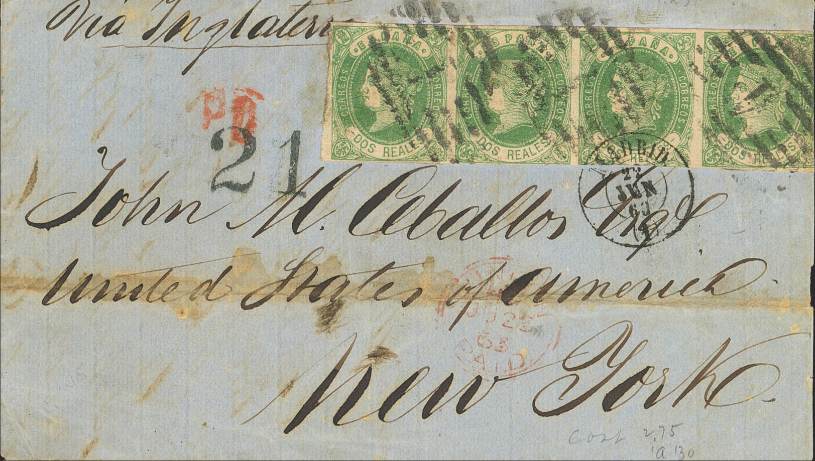 62(4). 1863. 2 green reales , four stamps. Front from MADRID to NEW YORK, via England. Postmark PARRILLA Nº1, valued on arrival with "21 cents". MAGNIFICENT AND UNUSUAL DOUBLE DELIVERY TO THE USA.