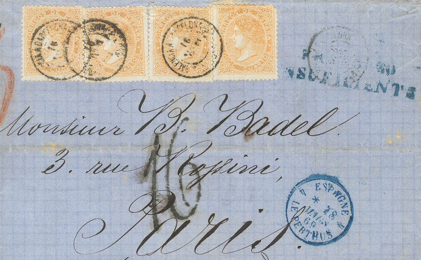 English 89(4). 1869. 12 orange cuartos , four stamps. TARRAGONA to PARIS. Postmark AMBULANTE / BARCELONA-VALENCIA, on the front it marks POSTAGE / INSUFFICIENT. MAGNIFICENT AND VERY RARE QUADRUPLE CARRY.