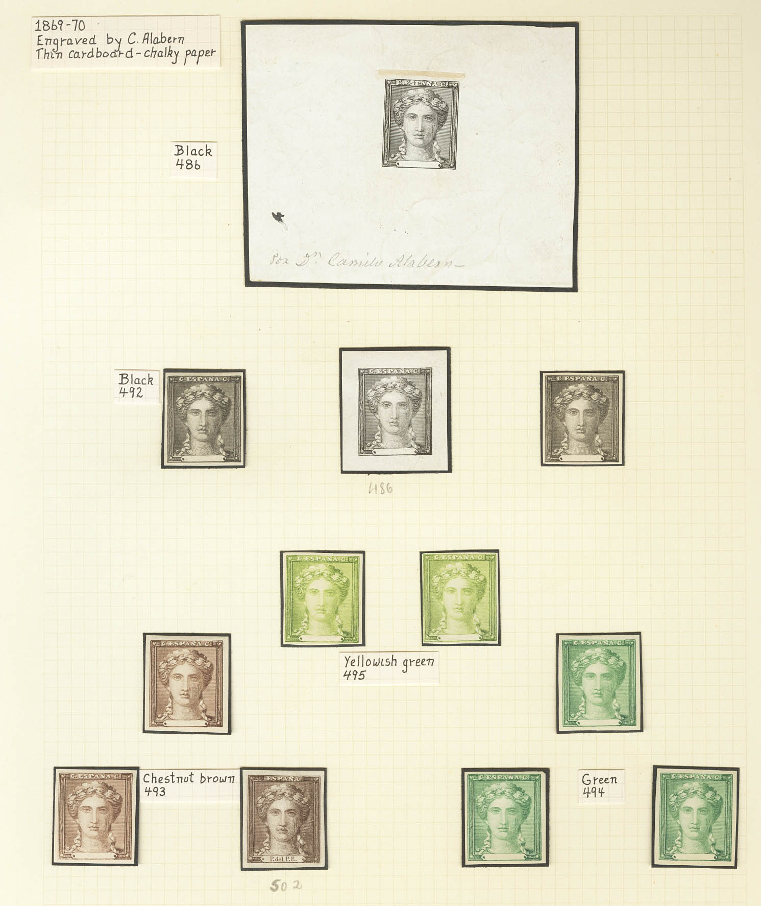 (★)1869. Spectacular set that includes two PUNCH PROOFS (one of them with the name of the engraver) and twenty-three COLOR TESTS of a non-adopted design, made by C.Alabern for the Provisional Government with the legend SPAIN. MAGNIFICENT AND VERY RARE SET.