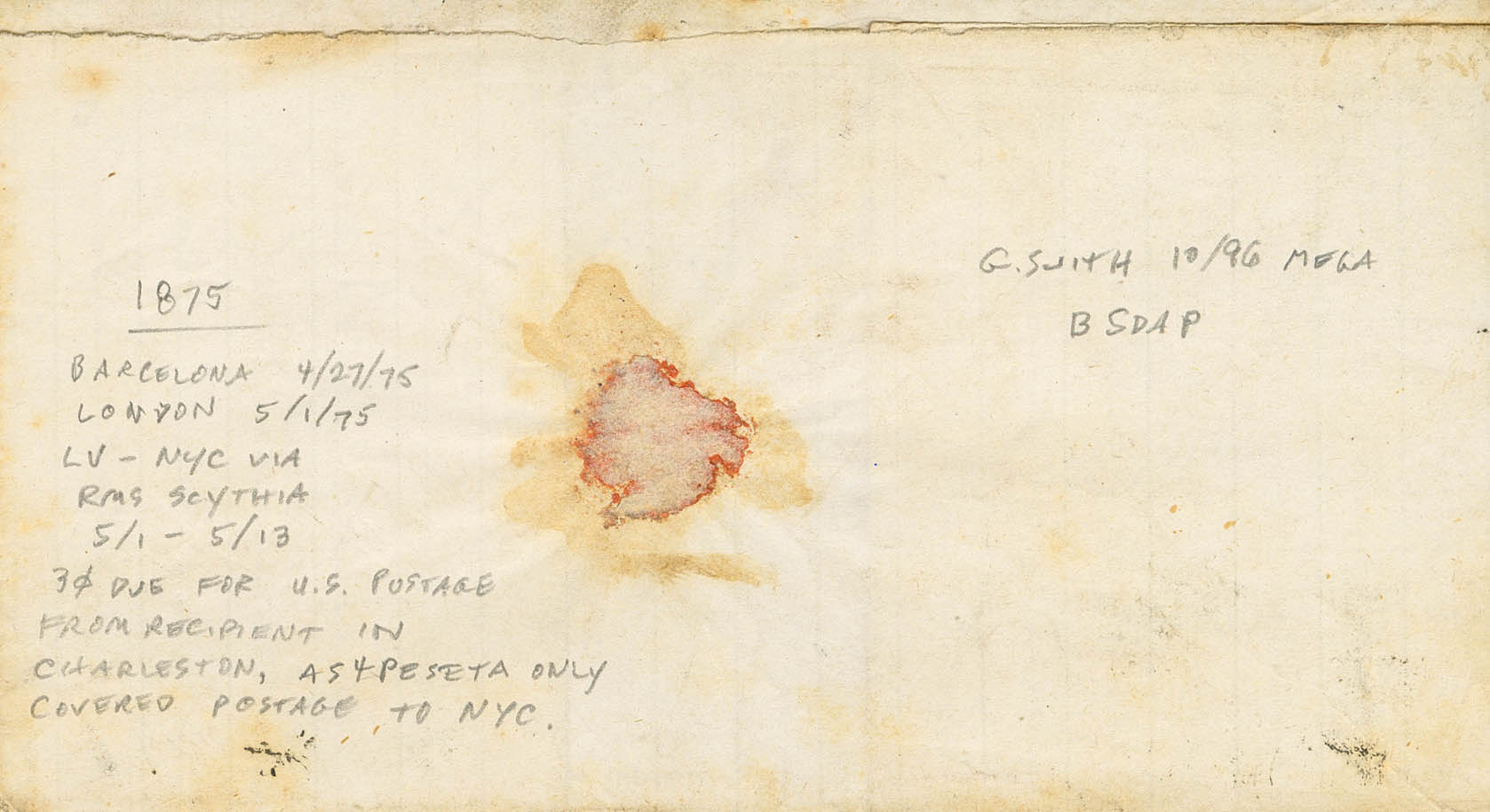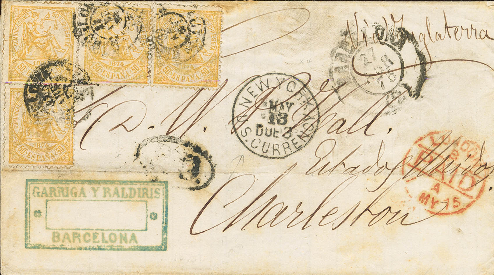 149(4). 1874. 50 cts yellow, four stamps. BARCELONA to CHARLESTON (UNITED STATES). MAGNIFICENT AND SPECTACULAR DOUBLE POSTAGE POSTAGE.