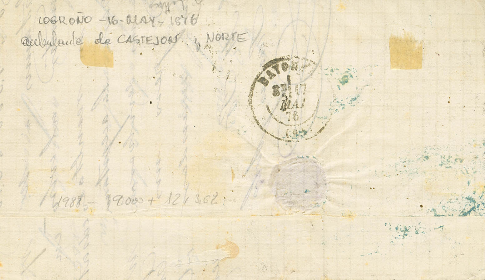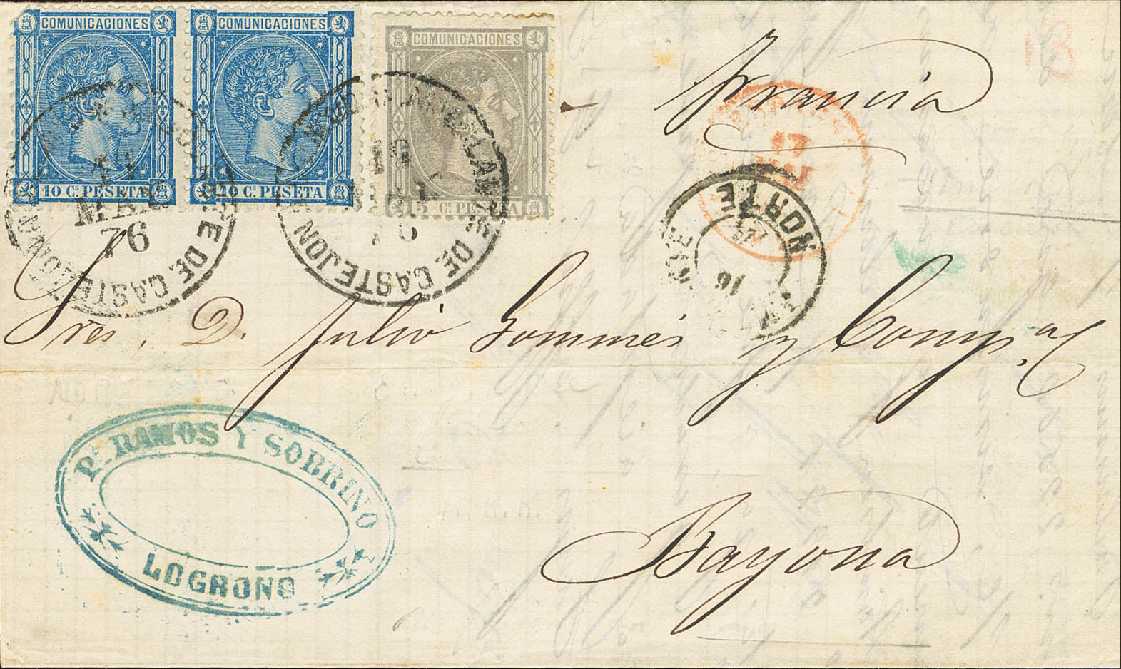 English 163, 164(2). 1876. 5 cts gray and 10 cts blue, pair. LOGROÑO (LA RIOJA) to BAYONA (FRANCE). TRAVELING POSTMARK FROM CASTEJON TO BILBAO. MAGNIFICENT AND RARE. Ex-Perpigna.