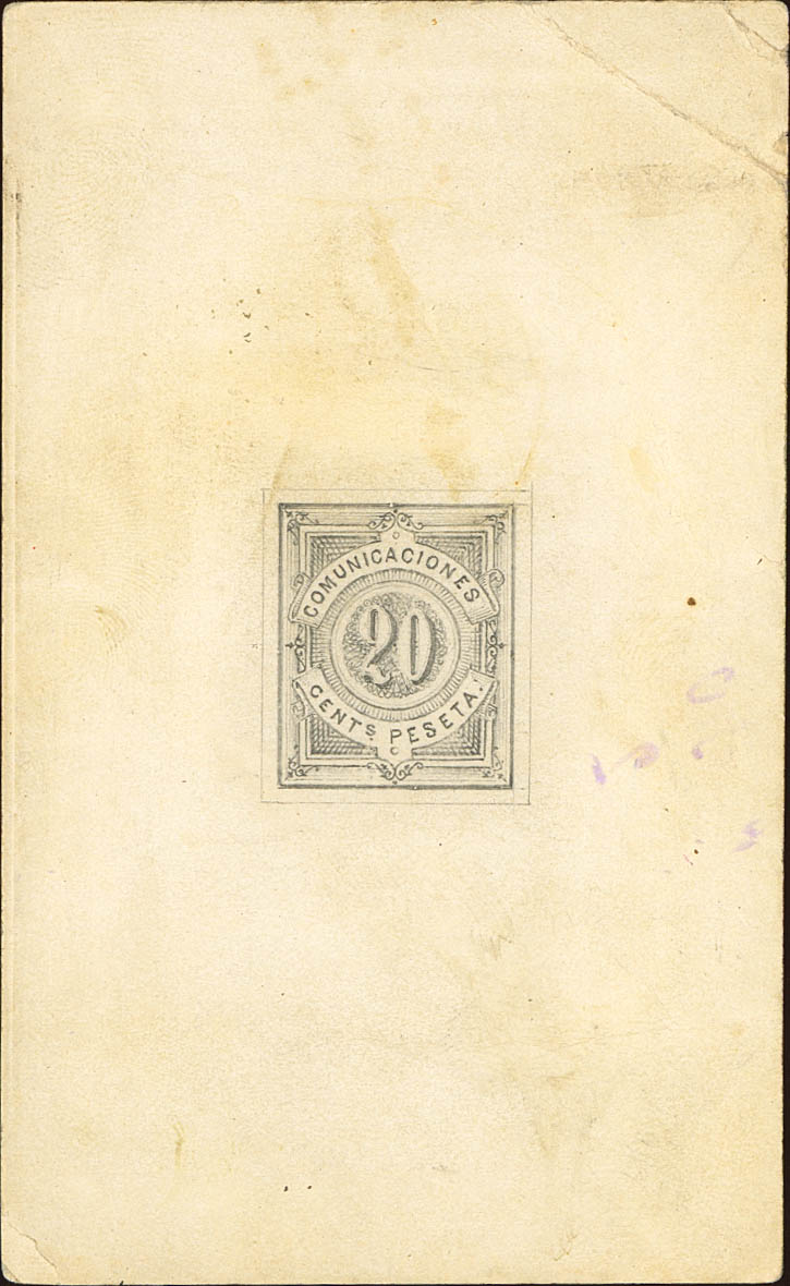 (★)1876. 20 cts black. BRADBURY AND WILKINSON PROJECT, made with "charcoal" by hand (instead of Indian ink) of the same art as those reviewed by Gálvez on page 32 in his Tests and Essays work. MAGNIFICENT AND VERY RARE.