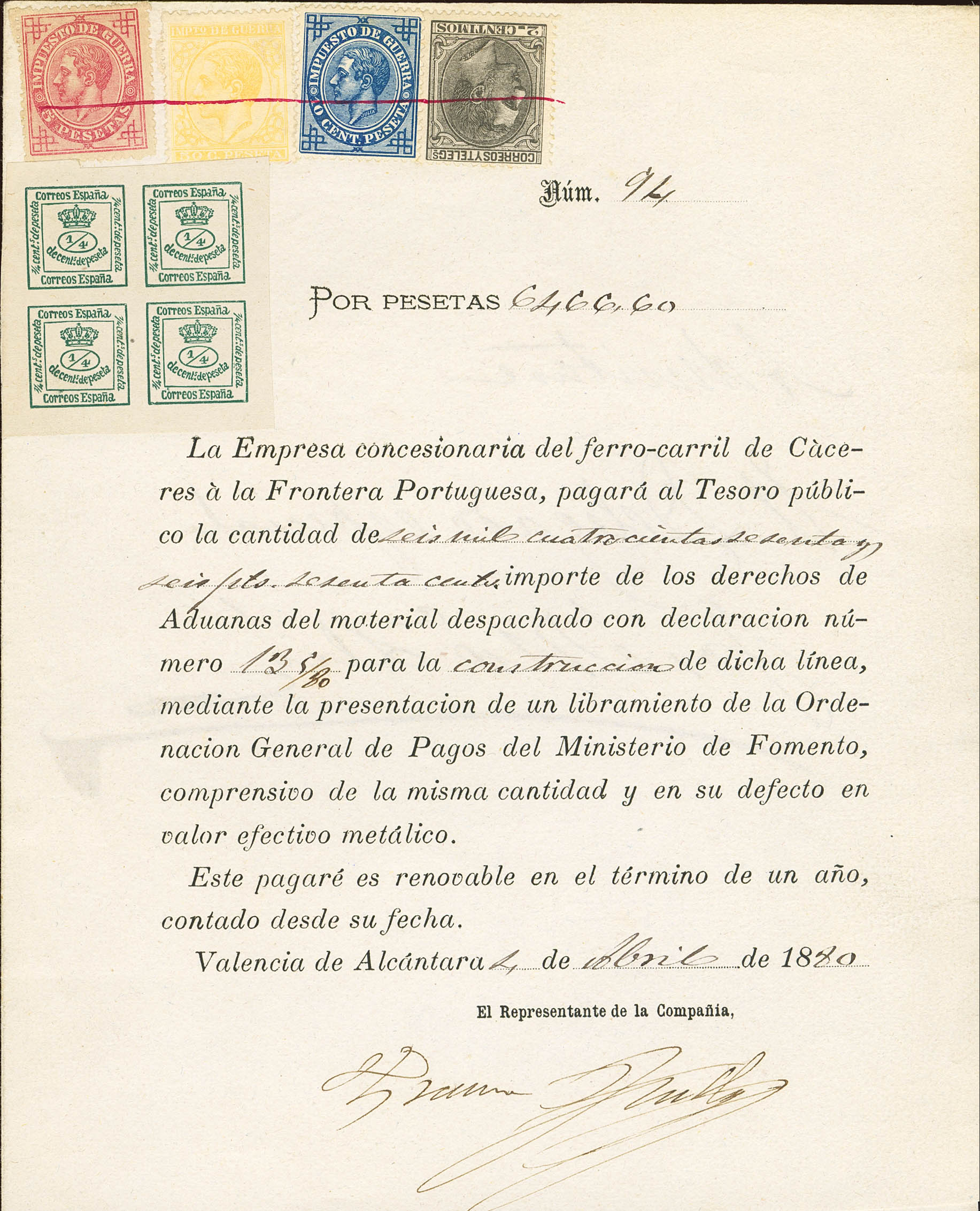 187, 189, 184, 200. 1880. 5 cts pink, 50 cts yellow, 10 cts blue, 2 cts black gray from 1879 and 4/4 cts green. Payment document for the CACERES Railway to the Portuguese border dated VALENCIA DE ALCANTARA. Unused pen stamps. MAGNIFICENT AND VERY RARE DOCUMENT WITH WAR TAX STAMPS OF TWO ISSUES.