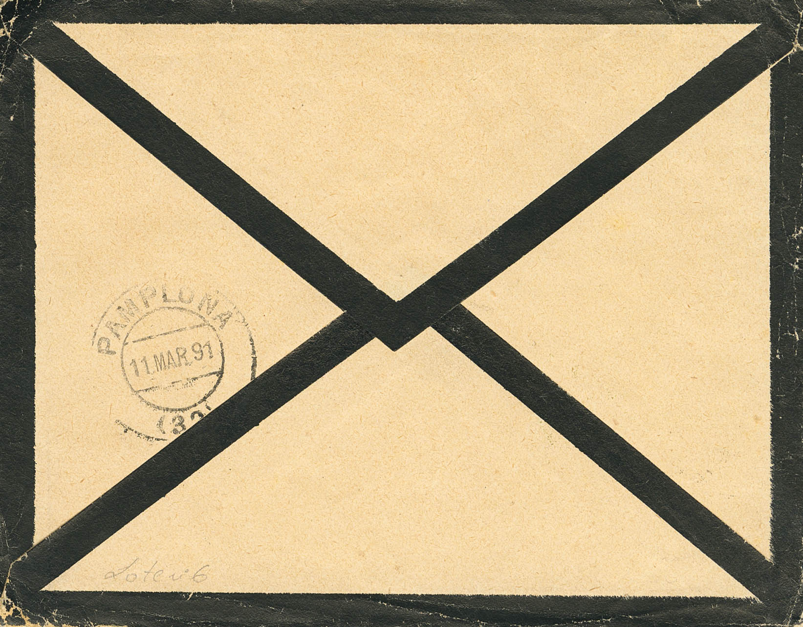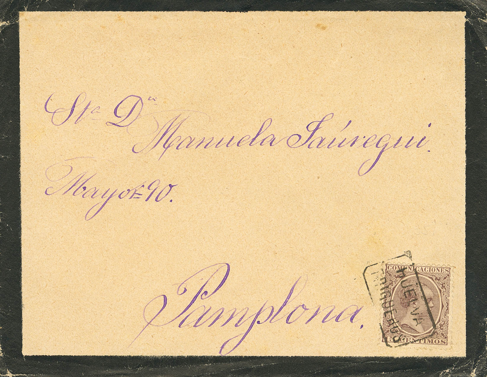 219. 1891. 15 cts chestnut. TRIGUEROS to PAMPLONA. HUELVA / TRIGUEROS letter postmark. MAGNIFICENT.