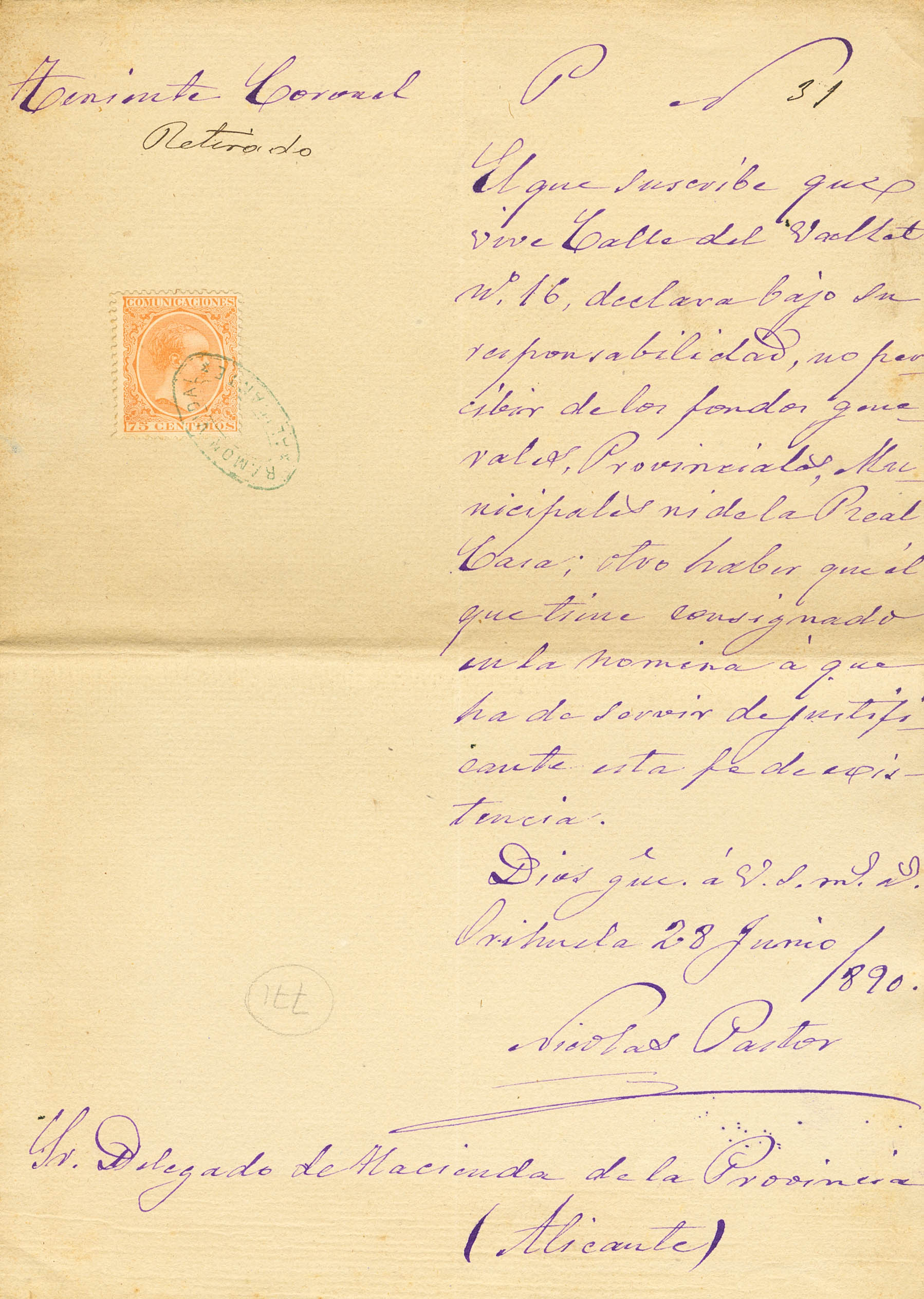 225. 1890. 75 cts orange on document signed in ORIHUELA. Private postmark RAMON VIDAL / ALICANTE, in blue. MAGNIFICENT AND RARE TAX USE.