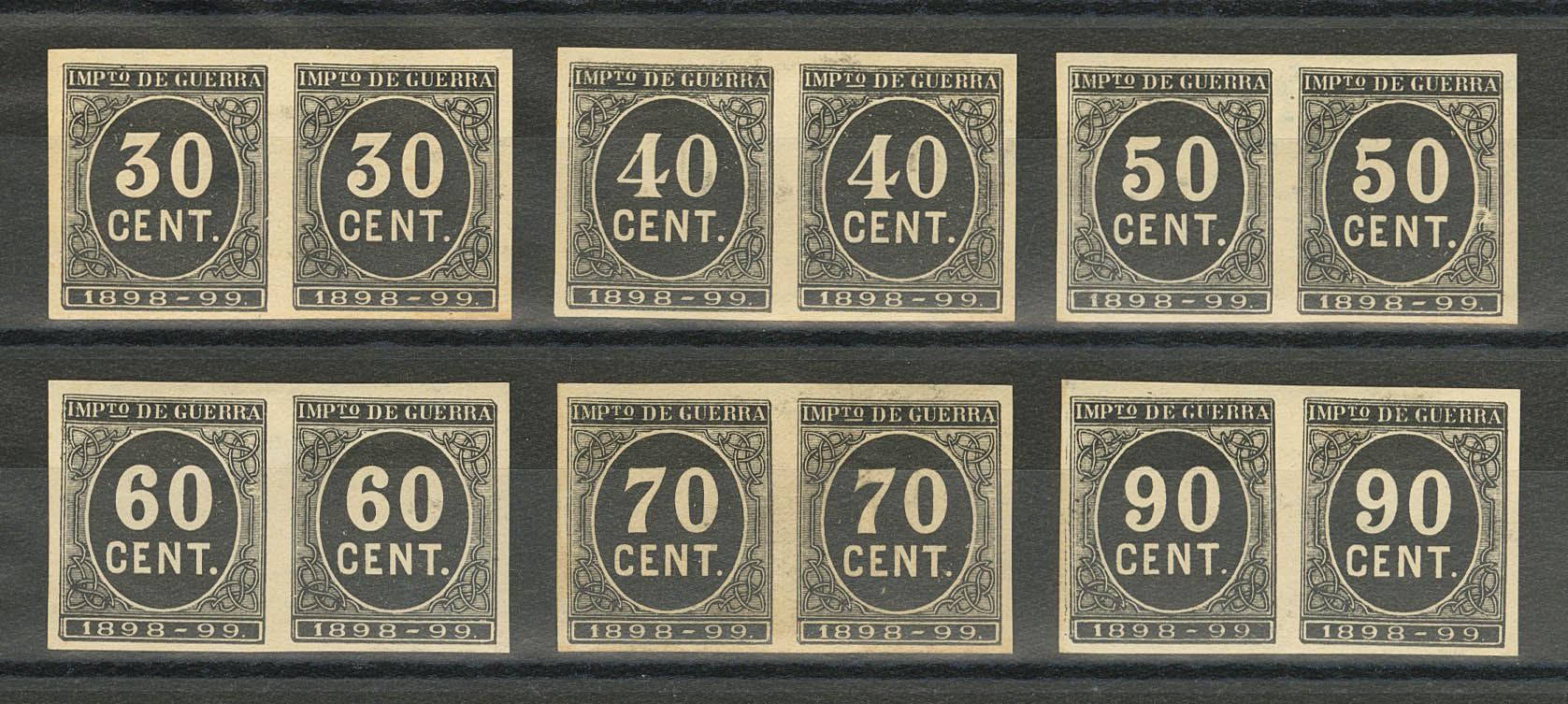 ★1898. 30 cts, 40 cts, 50 cts, 60 cts, 70 cts and 90 cts black, pairs. WITHOUT TOOTH. MAGNIFICENT AND RARE. (Germany 25/30s)