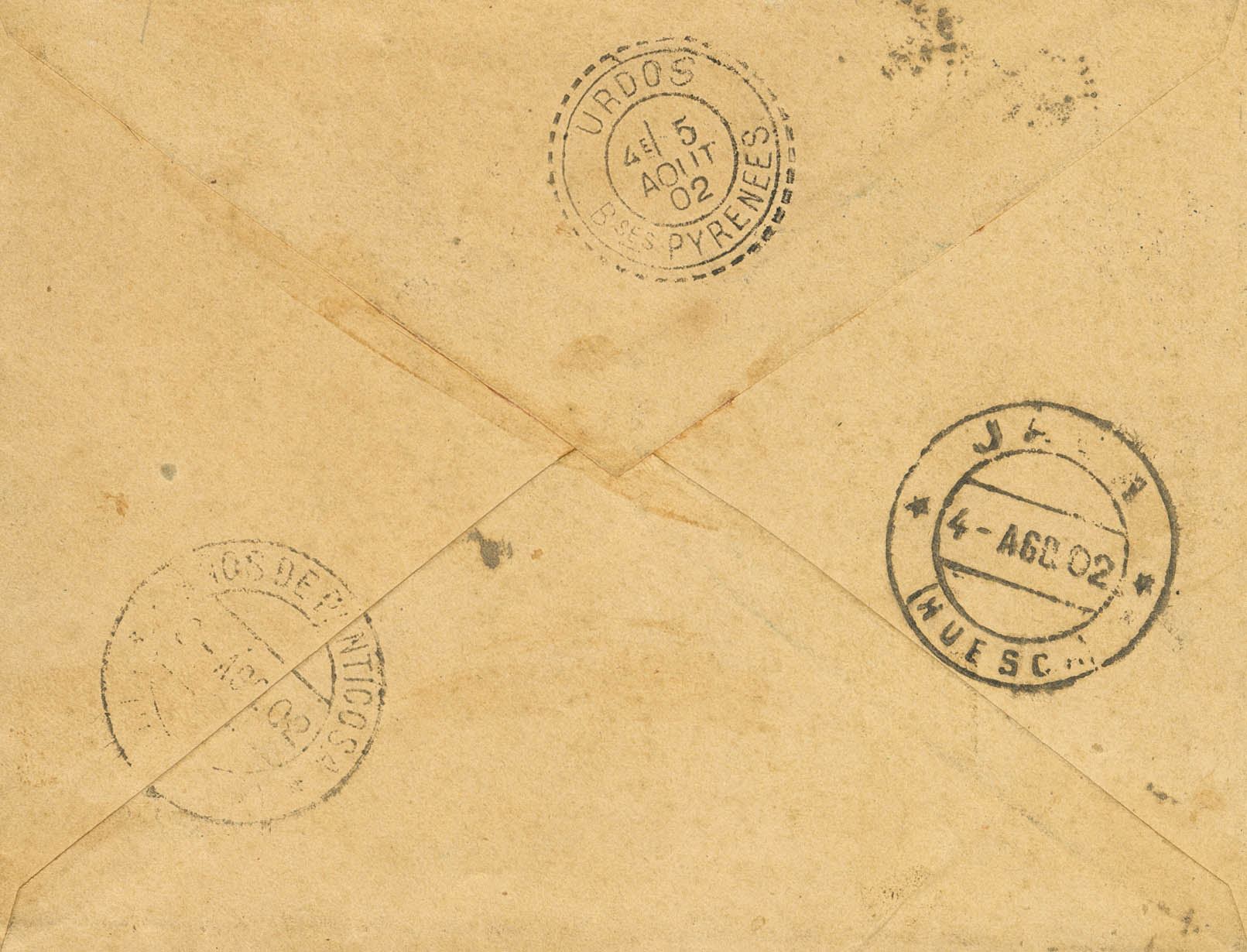 245. 1902. 15 cts violet and French rate stamps of 5 cts and 15 cts. BARCELONA to BAÑOS DE PANTICOSA (HUESCA), reshipped to PUY DE DOME (FRANCE), where it is appraised. On the back various transit and arrival marks. MAGNIFICENT AND RARE.