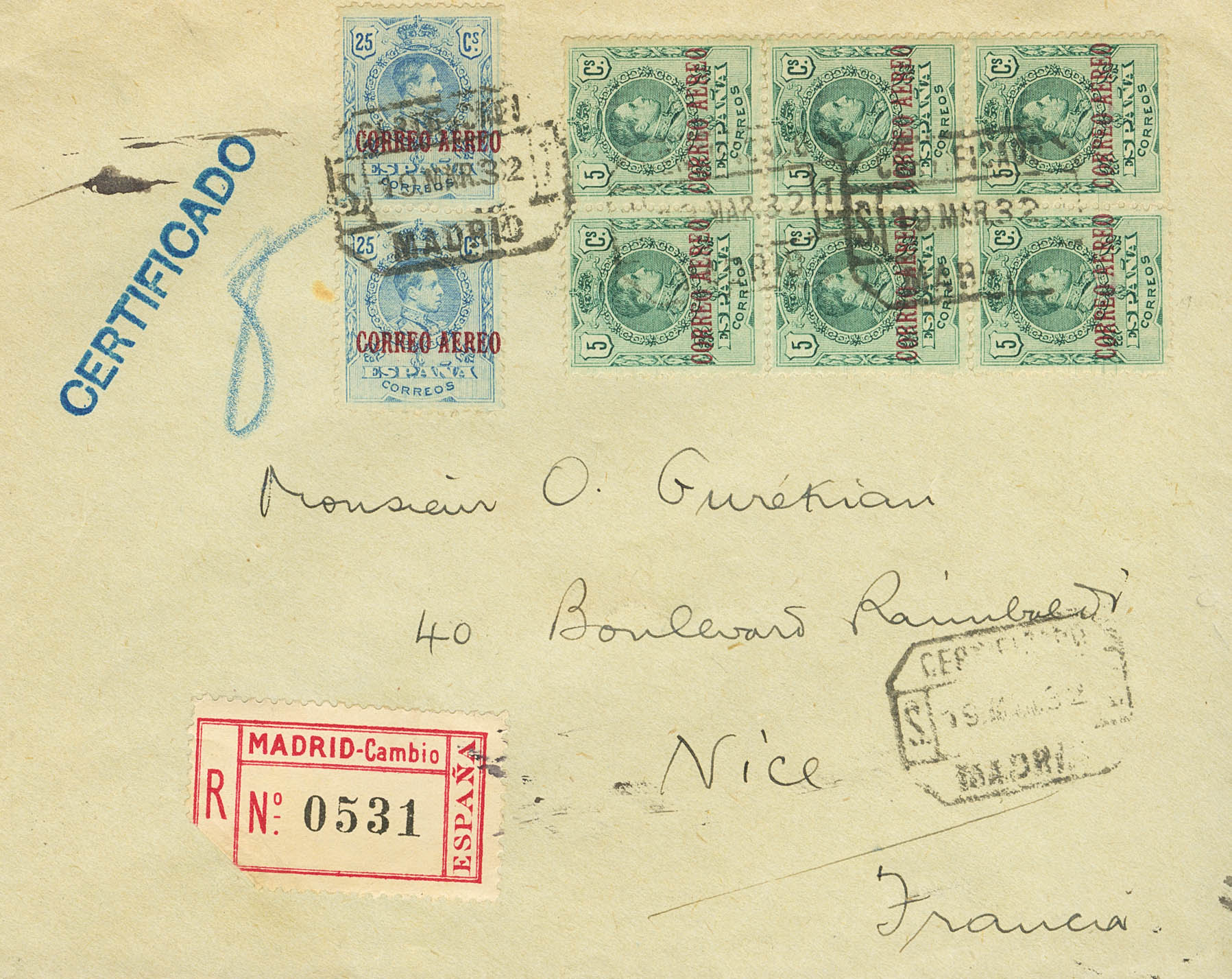 292(6), 294(2). 1932. 5 cts verde, bloque de seis y 25 cts azul, pareja. Certificado de MADRID a NIZA (FRANCIA). Al dorso llegada. MAGNIFICA Y ESPECTACULAR.