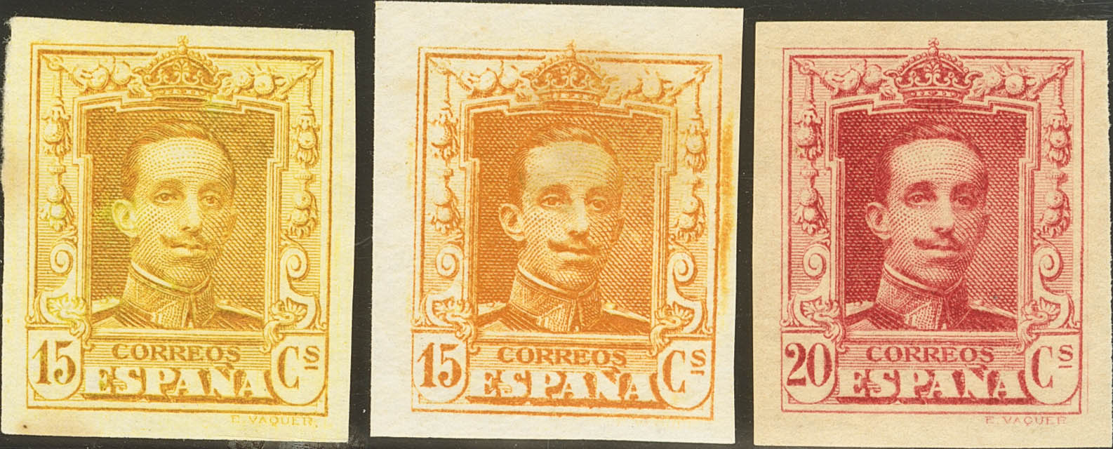(★) 315P(3). 1922. Set of three COLOR TESTS (undented) of the 15 cts and 20 cts of Vaquer (usual conservation), in different colors. MAGNIFICENT AND VERY RARE. (Gálvez, 2090, 2091, 2094)