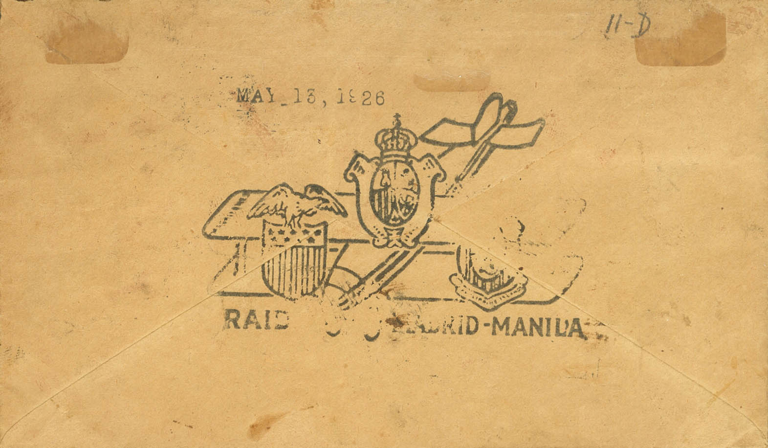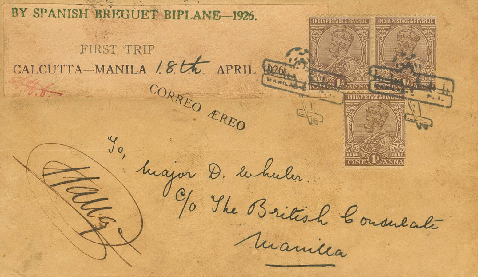 1926. 1 a castaño de India Británica, tres sellos. Dirigida a MANILA. Matasello "Fancy" aplicado a la llegada, banda adherida con leyenda BY SPANISH BREGUET BIPLANE-1926 / FIRST TRIP / CALCUTTA-MANILA 18 TH APRIL y firma del piloto Eduardo González Galarza. MAGNIFICA Y MUY RARA, SOLO SE REMITIERON CUARENTA Y TRES CARTAS EN ESTA ETAPA DEL VUELO MADRID-MANILA.