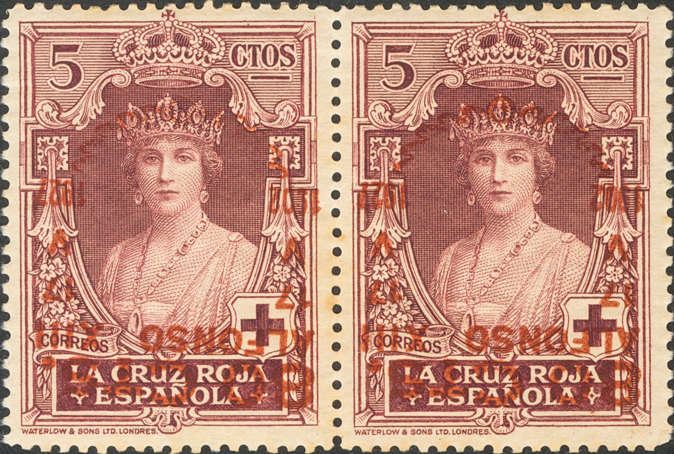 ★★/★ 382hi(2). 1927. 80 cts sobre 5 cts violeta castaño, pareja. SOBRECARGA INVERTIDA. MAGNIFICA. Edifil 2020: 214 Euros