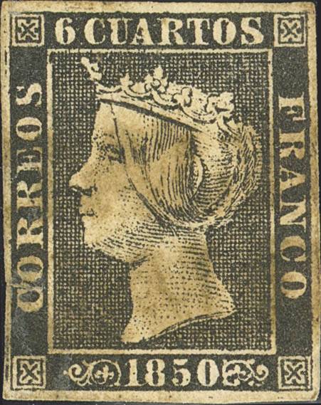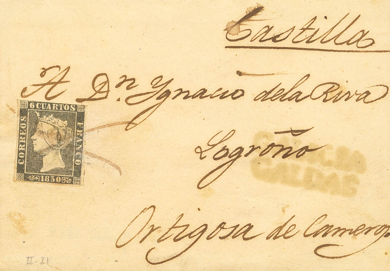 1. 1850. 6 cuartos black (II-17). GALICIA / CALDAS postmark, in green (rusty). MAGNIFICENT AND UNUSUAL. Cert. GRAUS (a franked letter is accompanied with an unused black 6- cuartos with ink stripes and on the front the pre-philatelic mark GALICIA / CALDAS for comparison of the mark).