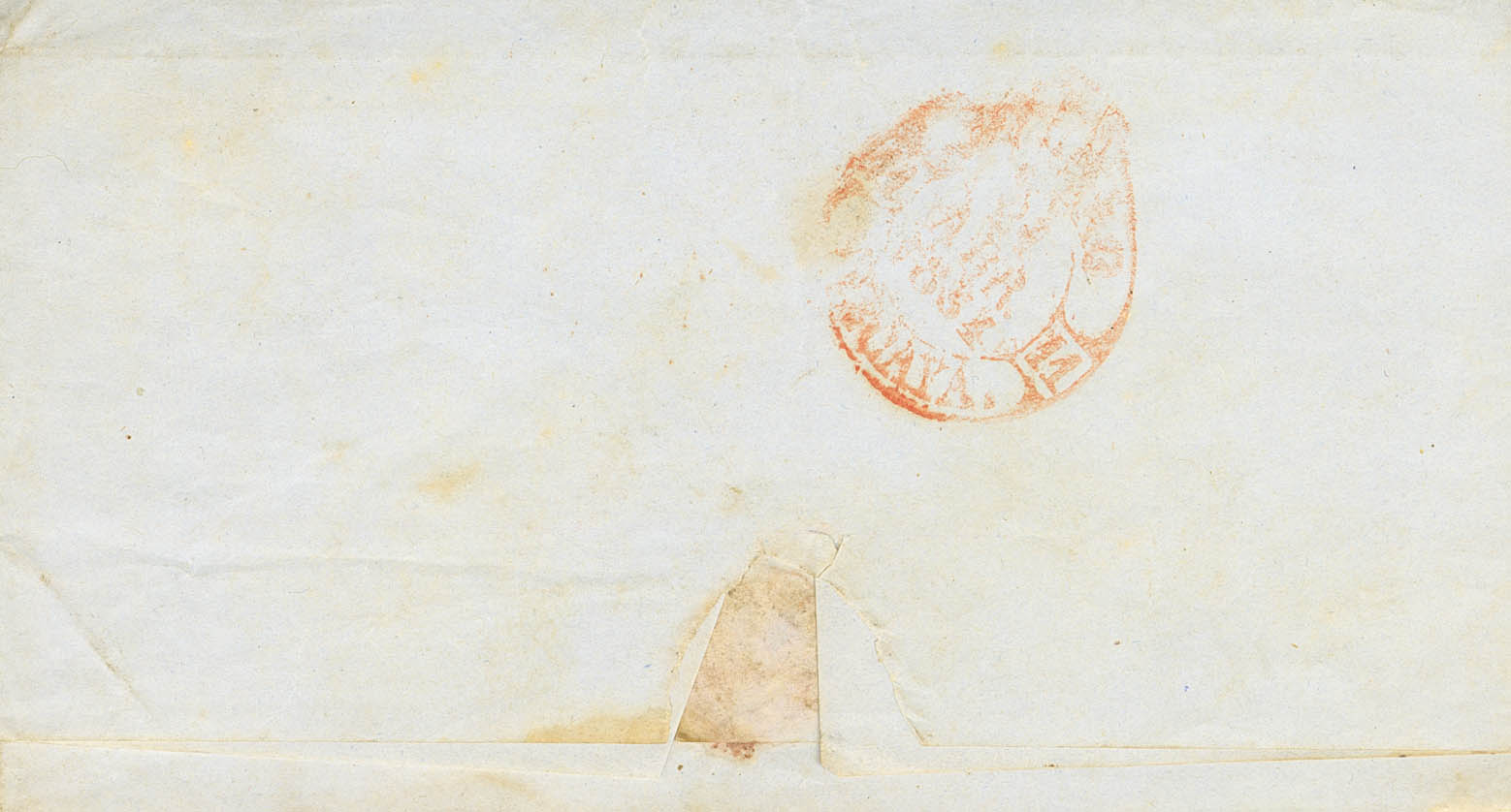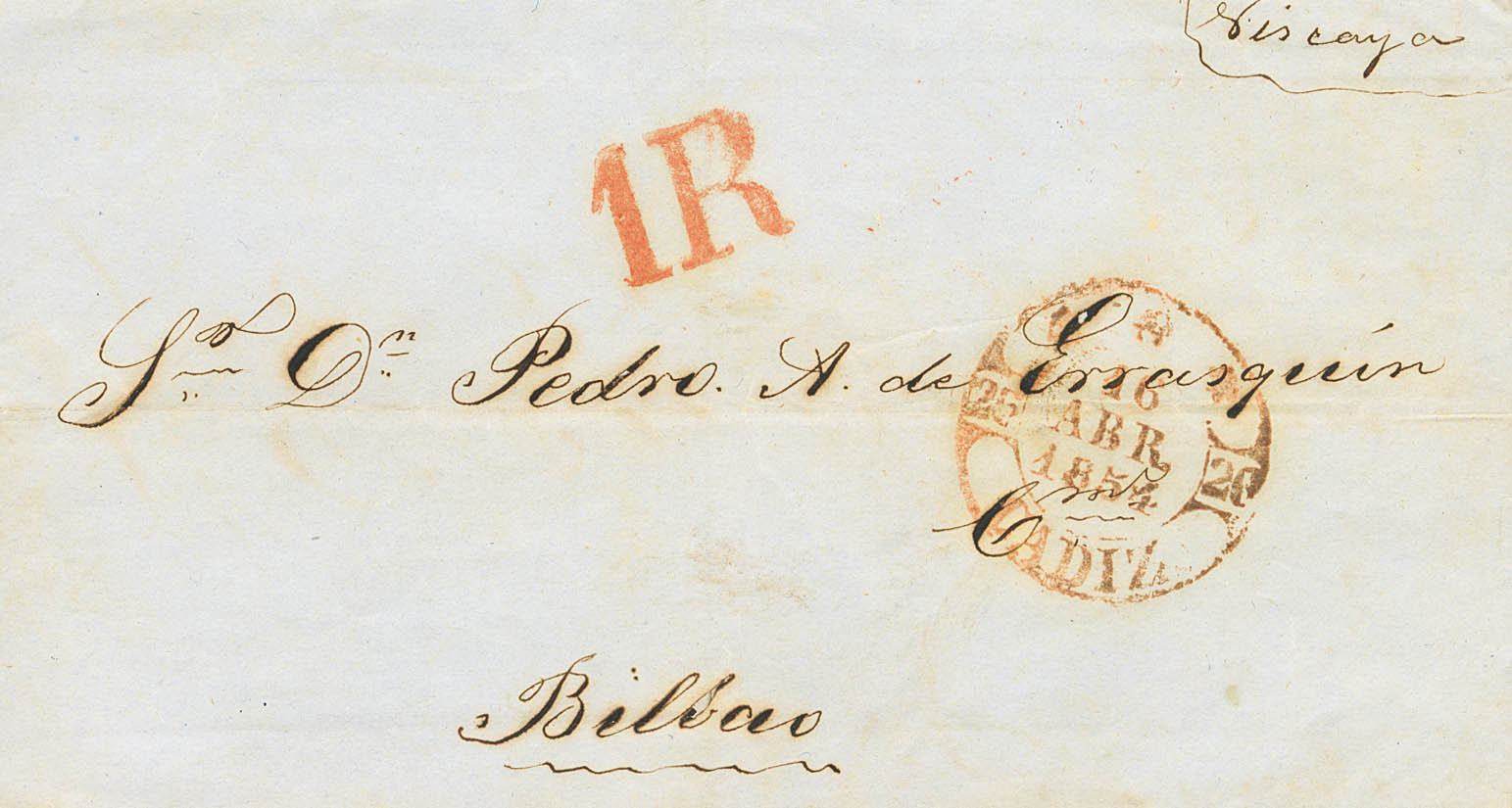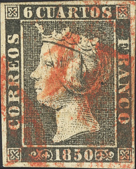 1. 1850. 6 cuartos black (I-13). Pre-philatelic postmark "1 R", in Bilbao red. MAGNIFICENT AND VERY RARE. Cert. GRAUS (pre-philatelic letter is attached for comparison of the brand).