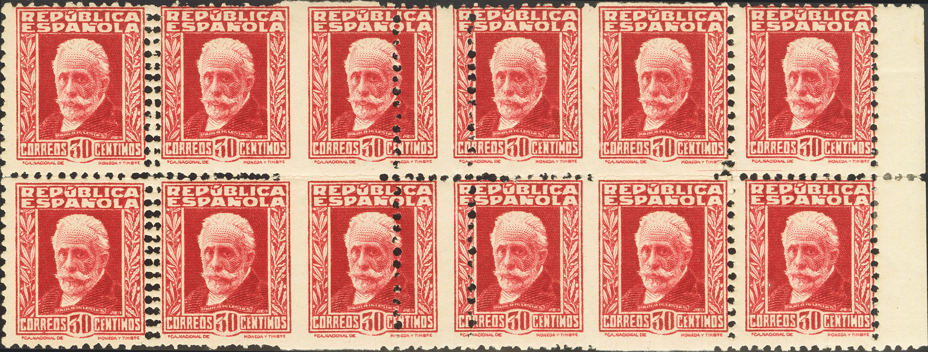 ★★/★ 659(12). 1931. 30 cts carmine, block of twelve, leaf edge. VARIETY OF TOOTHING. MAGNIFICENT AND VERY SPECTACULAR.