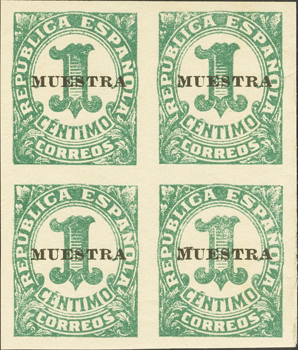 ★★ 677M(4). 1933. 1 cts verde, bloque de cuatro. MUESTRA. MAGNIFICO. Edifil 2020: 136 Euros