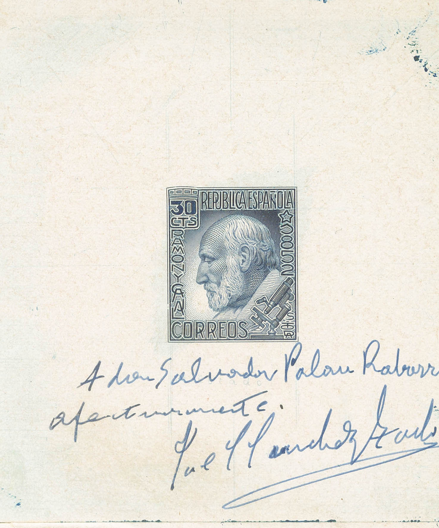 (★) 680P. 1934. 20 cts azul. PRUEBA DE PUNZON (sin pie de imprenta) y firmada por el grabador. MAGNIFICA Y MUY RARA. (Gálvez, 3063)
