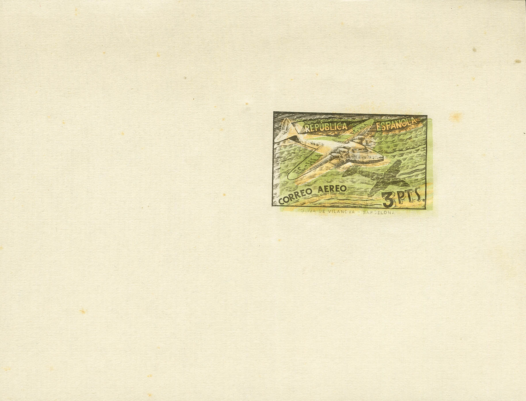 (★)(1931ca). Conjunto de dos pruebas de un proyecto no adoptado del 3 pts de correo aéreo, una de ellas se trata del proyecto casi definitivo con los colores sin ajustar y la otra se trata únicamente de la fase de color en verde. MAGNIFICA Y RARISIMAS, AMBAS SALIERON DE LA FACTORIA OLIVA DE VILANOVA Y TIENE SU INCONFUNDIBLE ESTILO.