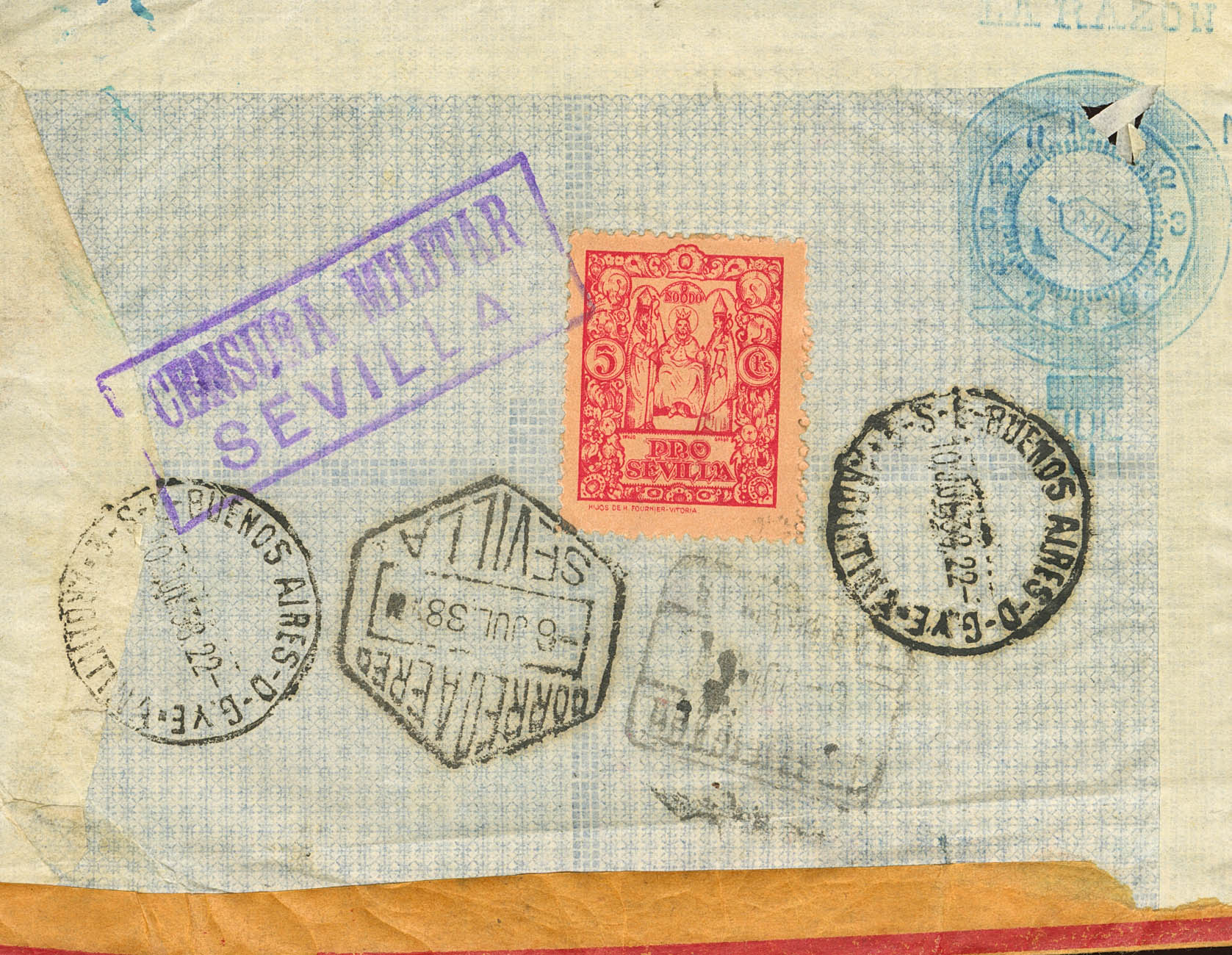 813, 844(2), 846(2). 1938. 10 pts chestnut, 30 cts red, two stamps and 1 pts blue, two stamps. Certificate from SEVILLE to BUENOS AIRES (ARGENTINA). On the back local charity of 5 cts and arrival. PRETTY.