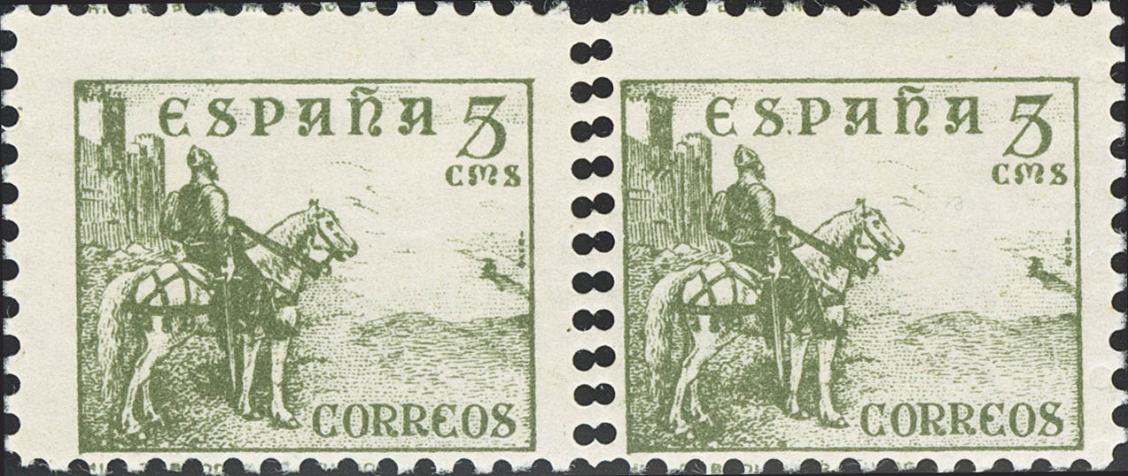 ★★ 816ec(2). 1937. 5 cts verde, pareja. CAMBIO DE COLOR y DENTADO DOBLE. MAGNIFICA Y RARA, NO CATALOGADO.