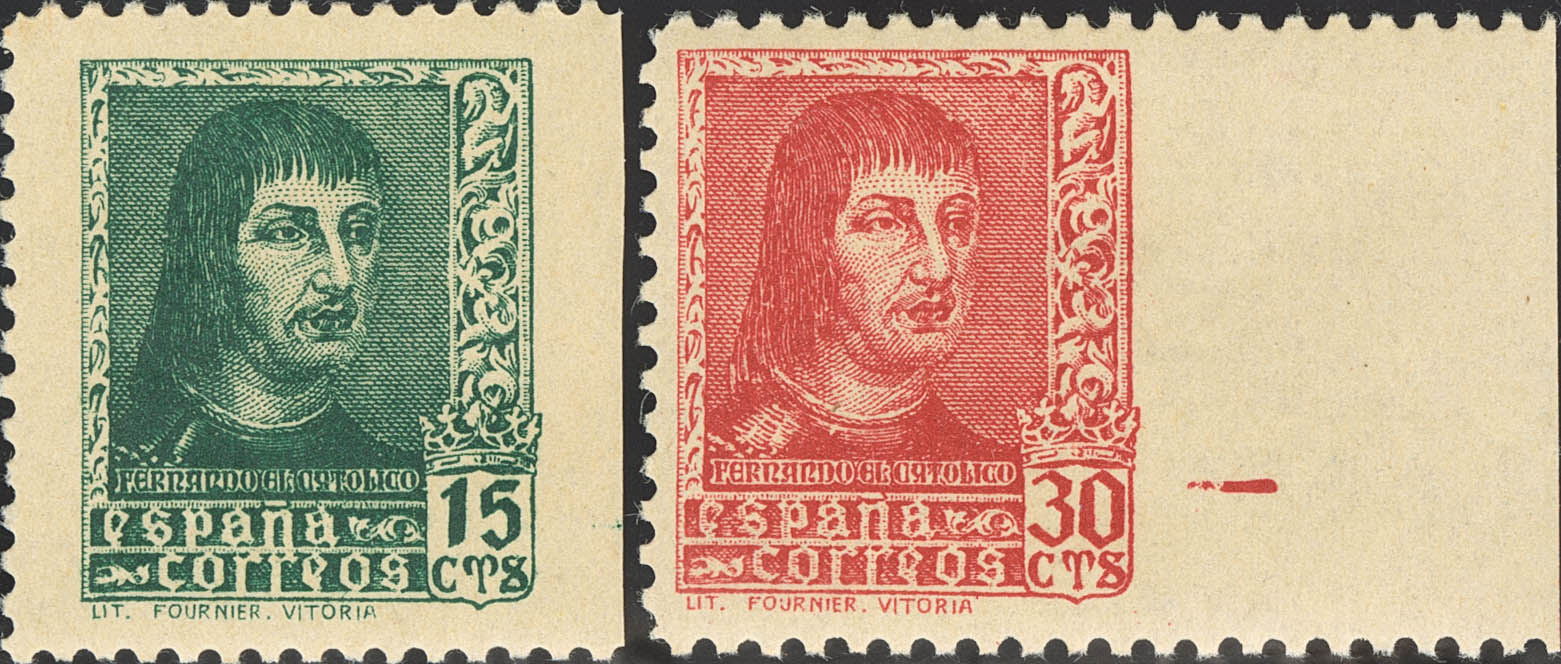 ★★ 841Asmd, 844Asmd. 1938. 15 cts green and 30 cts red. WITHOUT TEETHING THE RIGHT MARGIN. MAGNIFICENT, THE ONLY TWO VALUES CATALOGED BY EDIFIL. Edifil 2021: 88 Euros