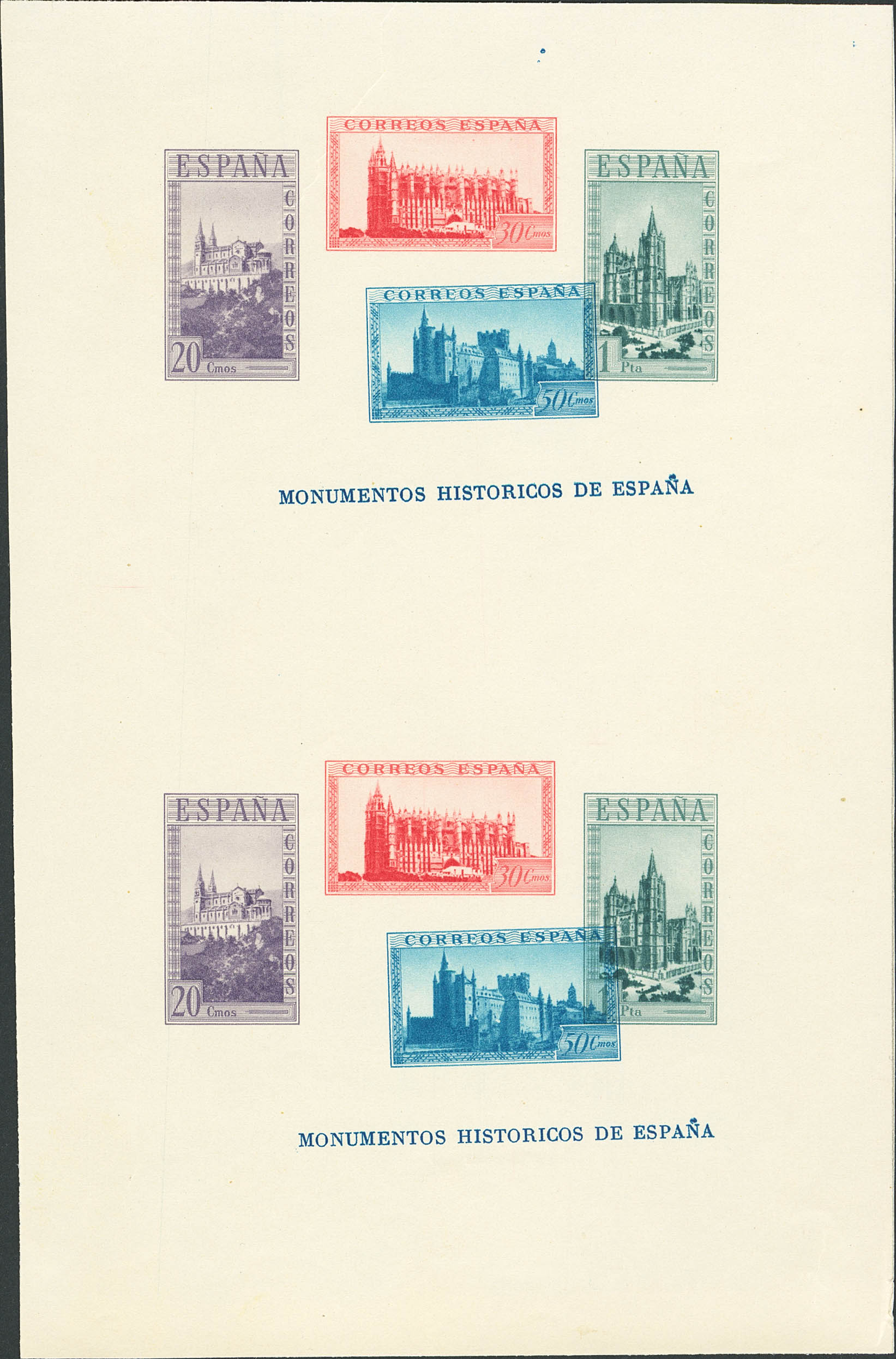 (★) 848P(2). 1938. Dos hojas bloque SIN DENTAR, en pareja vertical (sin cortar). Variedad COLOR AZUL DESPLAZADO. MAGNIFICA Y RARA.