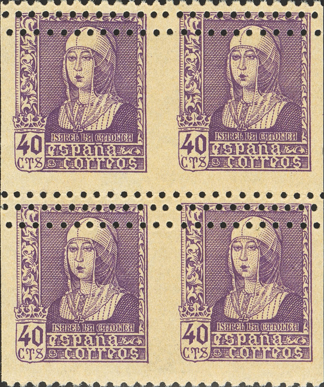 ★★ 858sva(4). 1938. 40 cts violet, block of four. HORIZONTAL TRIPLE TOOTH. MAGNIFICENT AND SPECTACULAR. Edifil 2021: ++120 Euros