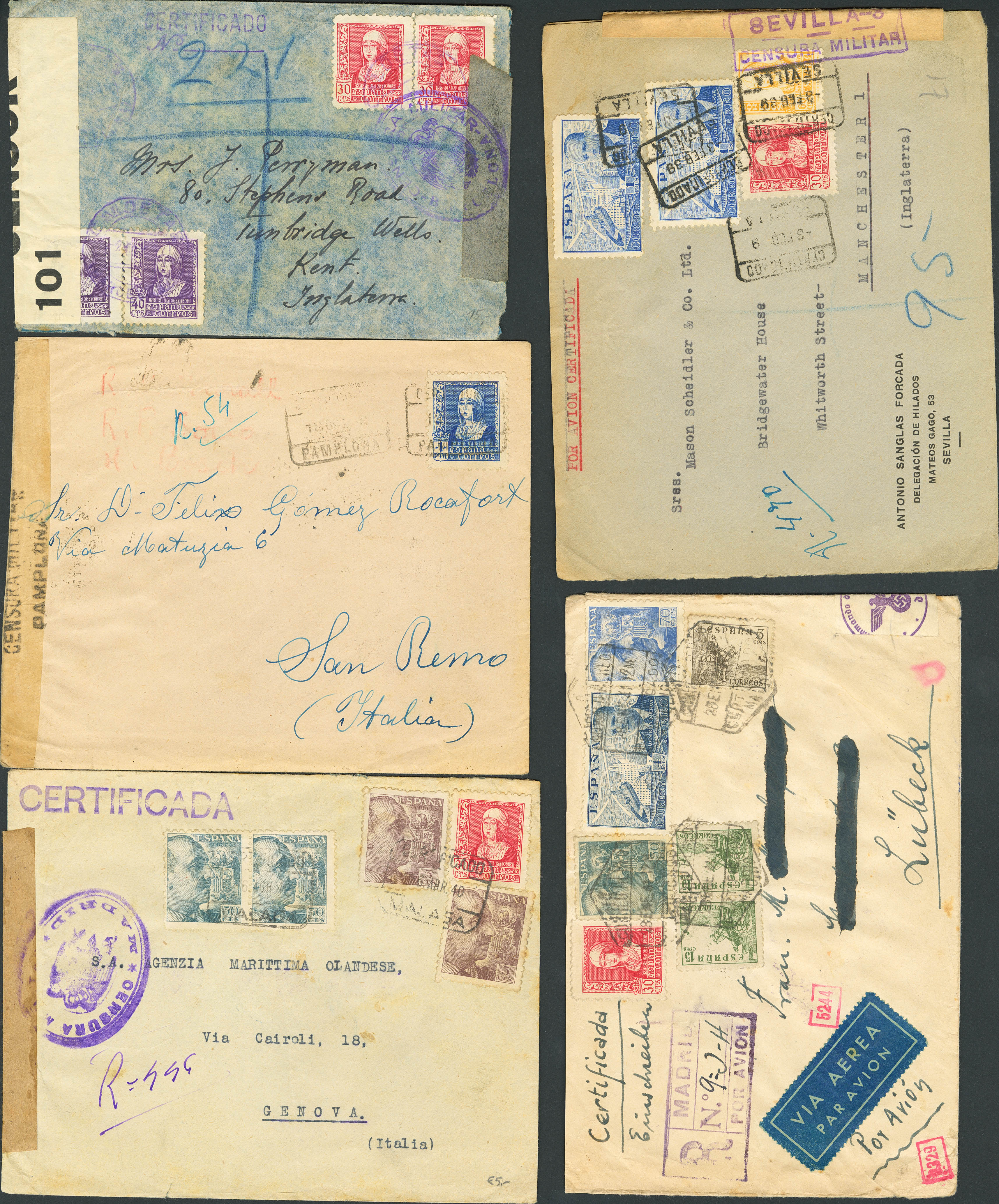 (1939ca). Conjunto de cinco cartas certificadas circuladas entre 1939 y 1941, dirigidas al extranjero, una con matasello especial CALDETAS / BARCELONA, en violeta. A EXAMINAR.