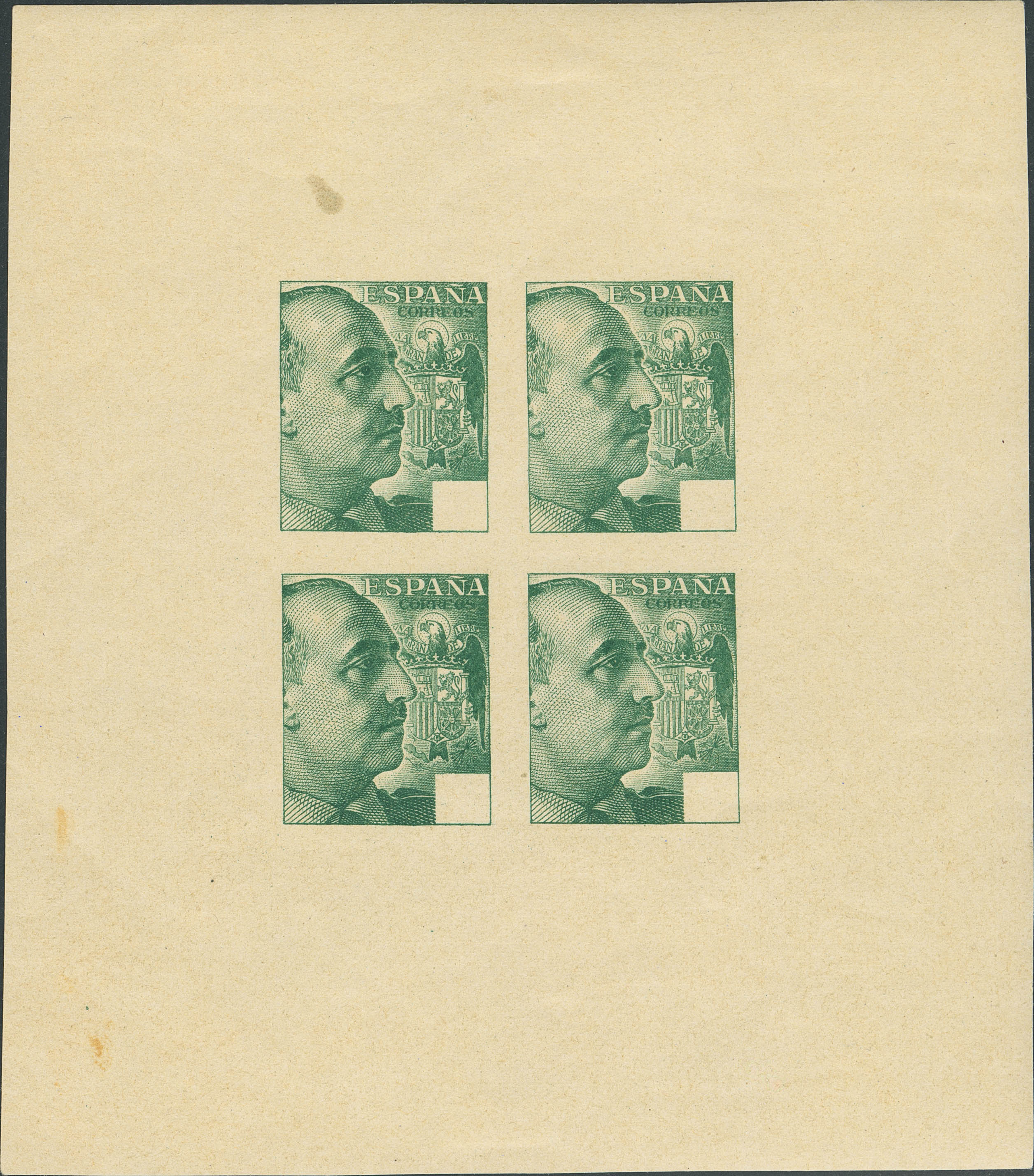 English ★1939. Without value figure, dark green, block of four. LITHOGRAPHIC REPORT BLOCK TEST. MAGNIFICENT AND RARE. (Gálvez 3615)