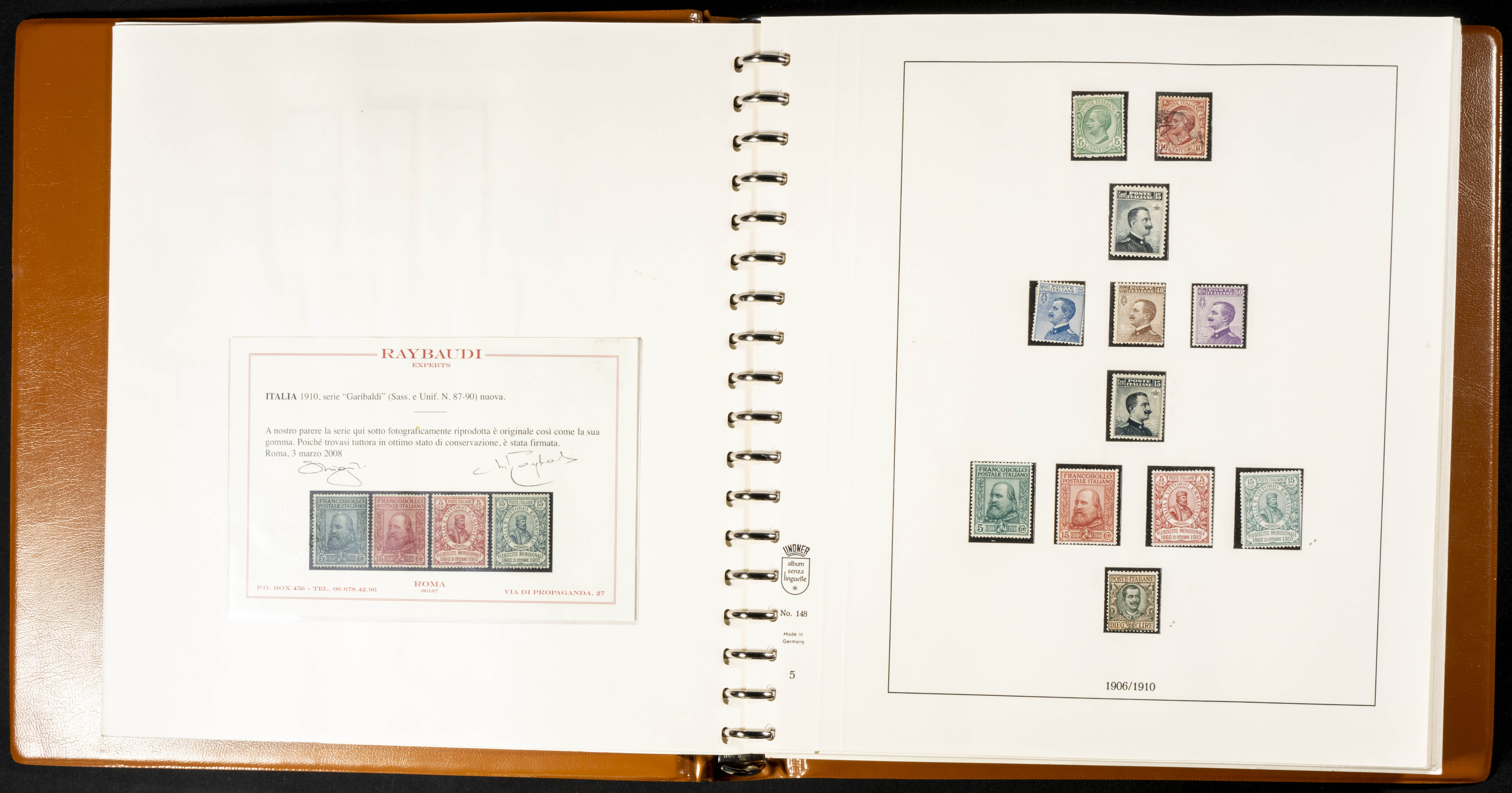 ★/(1862ca). Spectacular and very complete collection from Italy between 1862 and 2009, in new and used, until 1906 the majority used with some variety and from 1906 in new (some used series) very complete, with high value series such as Garibaldi 1910 (** and certificate), Congress of Trieste, Manzoni of 1923, 1st series of Republic, Aereos Balbo Servizio di Stato of 1933, Rome-Mogadiscio Servizio di Stato 1934, etc. and many series and stamps without fixers (mounted in Lindner albums). HIGHEST CATALOG VALUE. IT IS ESSENTIAL TO EXAMINE.
