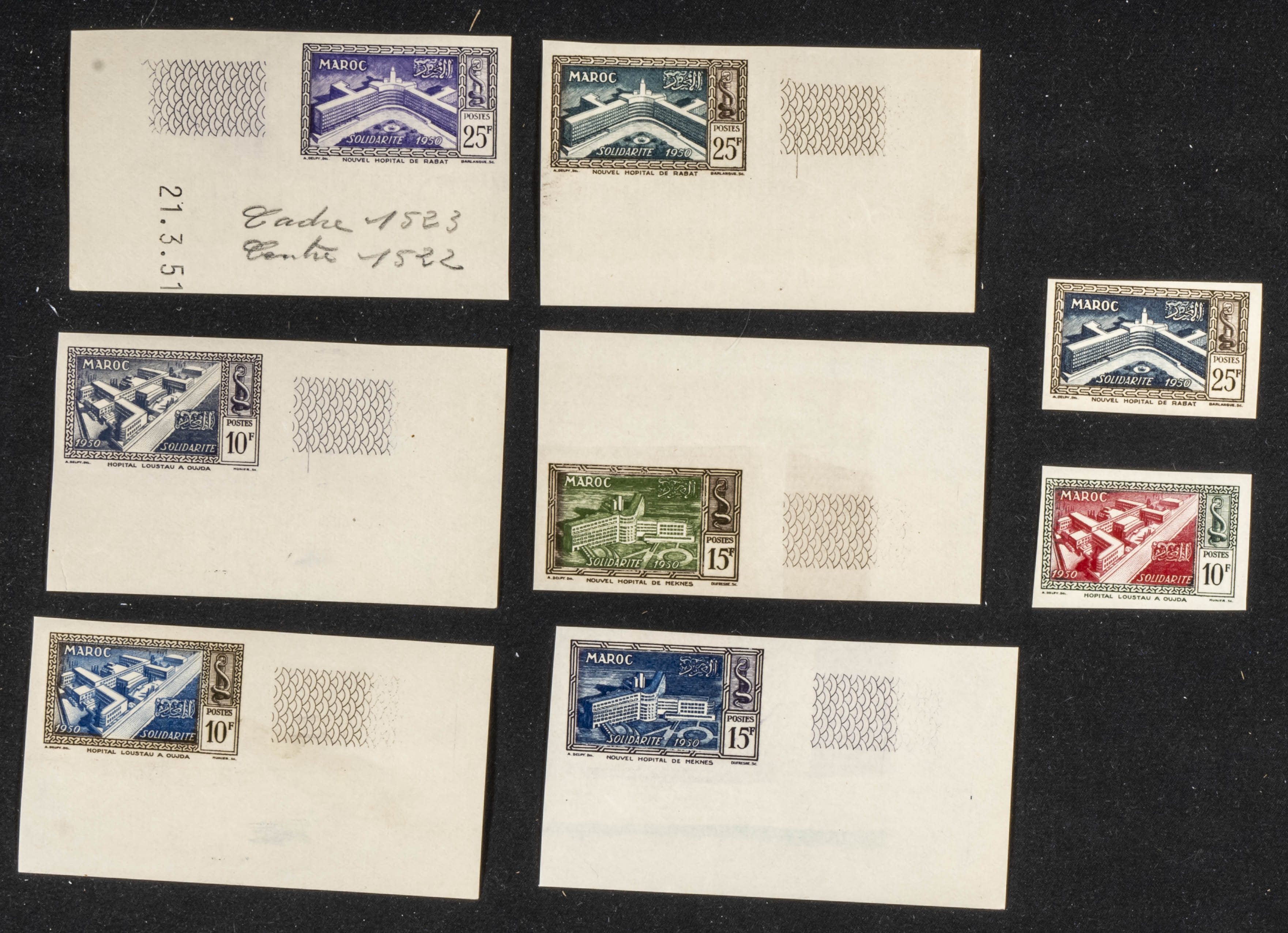 ★★Yvert 302/04. 1951. Set of eight COLOR ESSAYS (undented) from the complete 1951 series (solidarity) of Independent Morocco. TO EXAMINE.