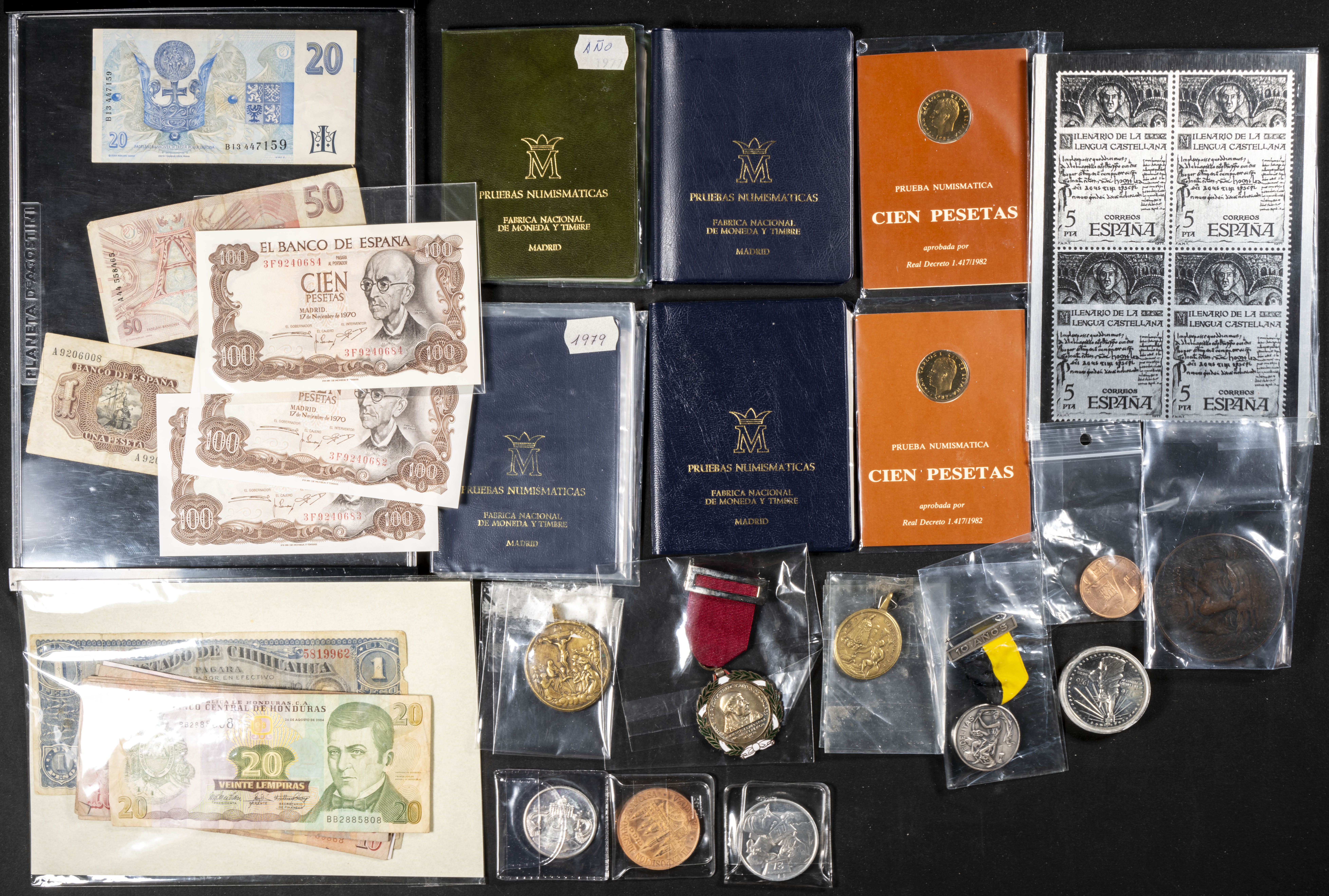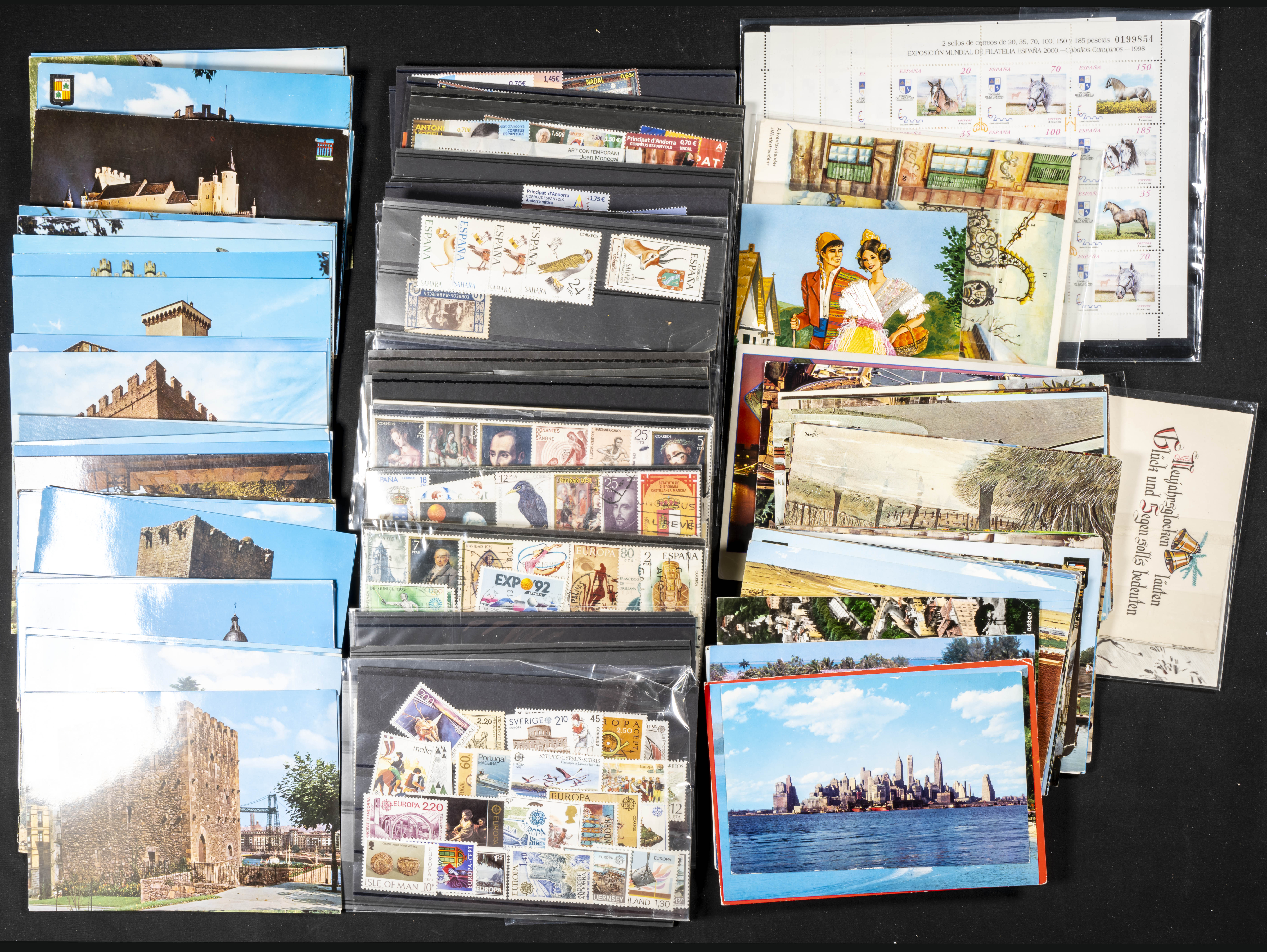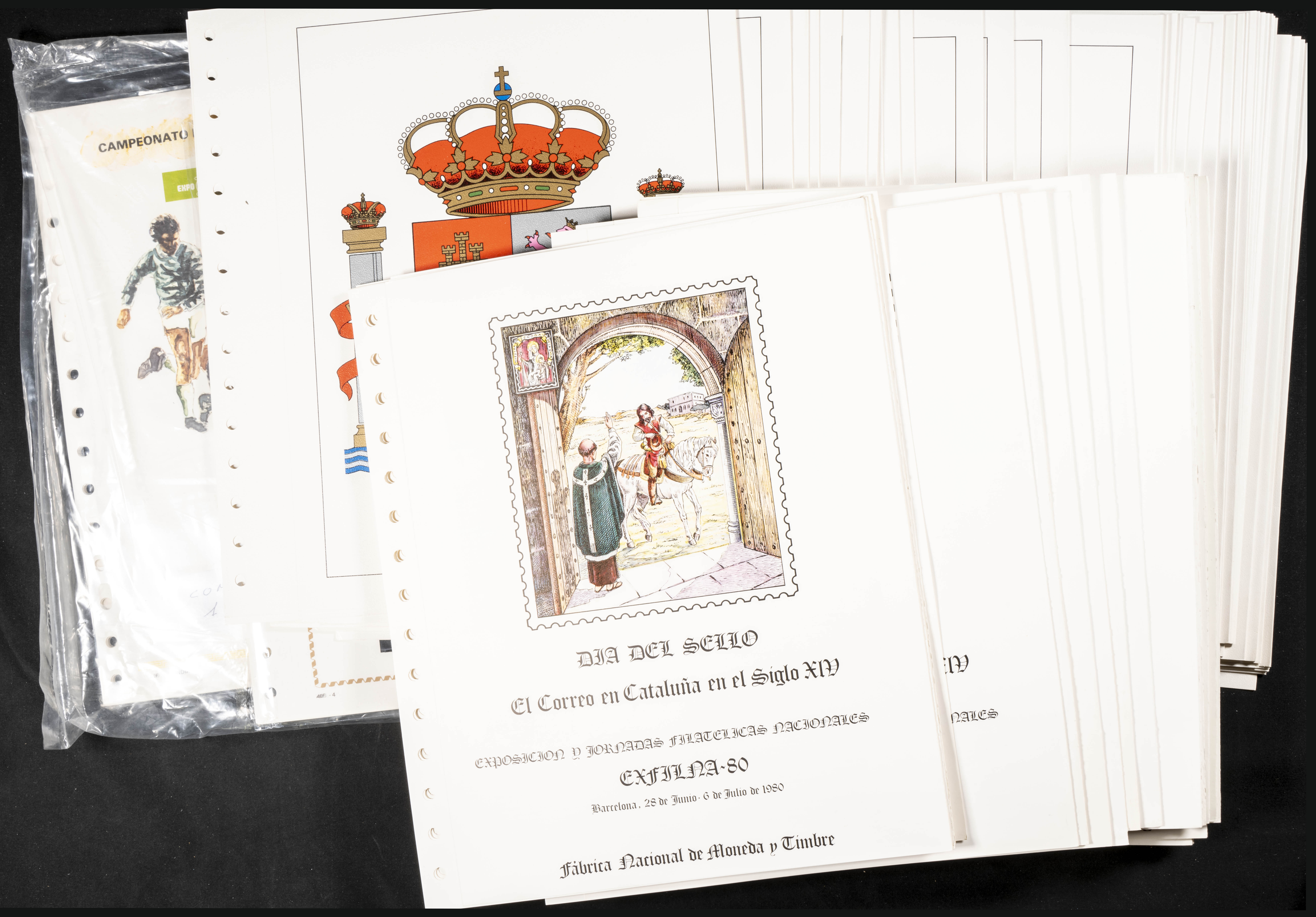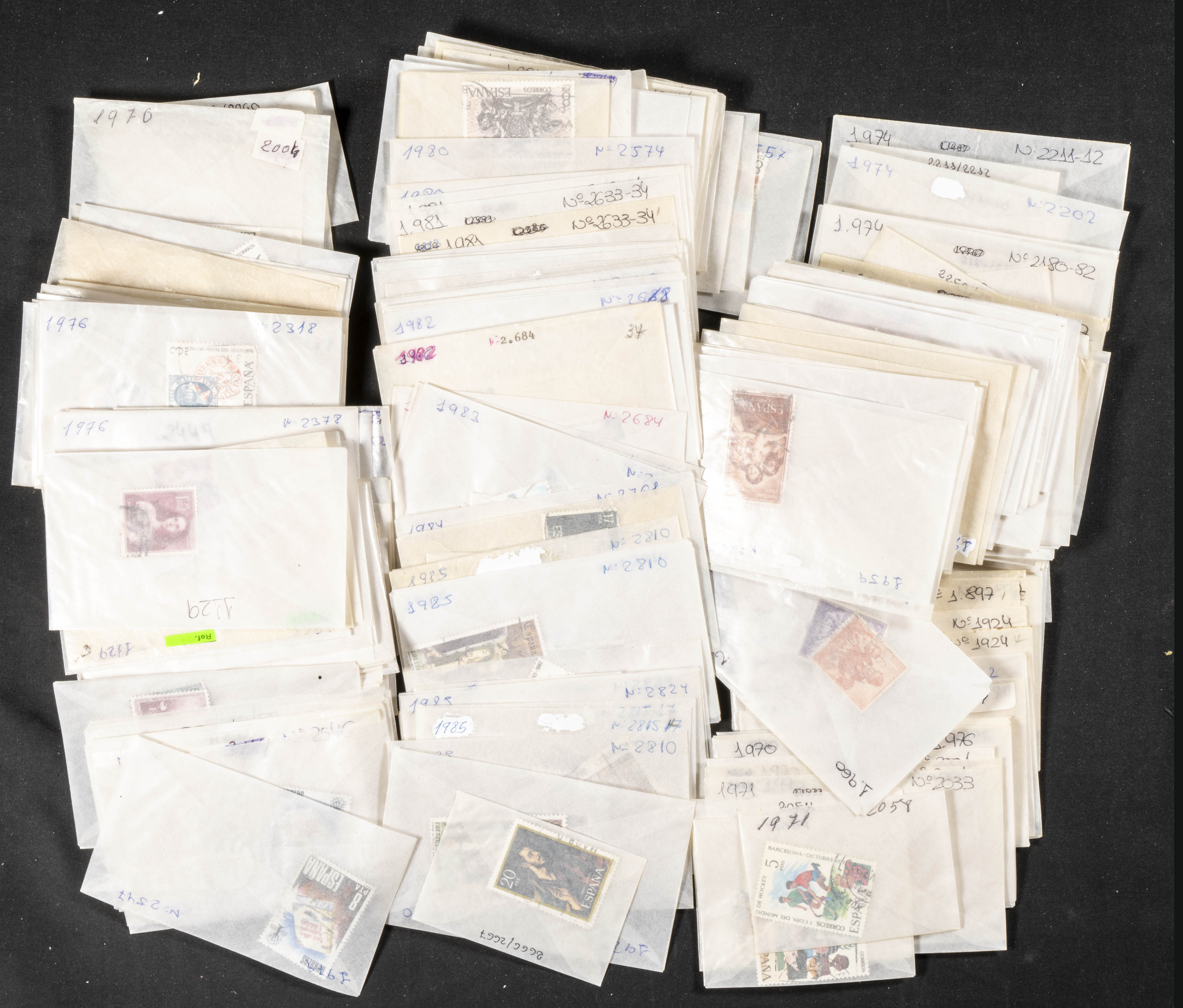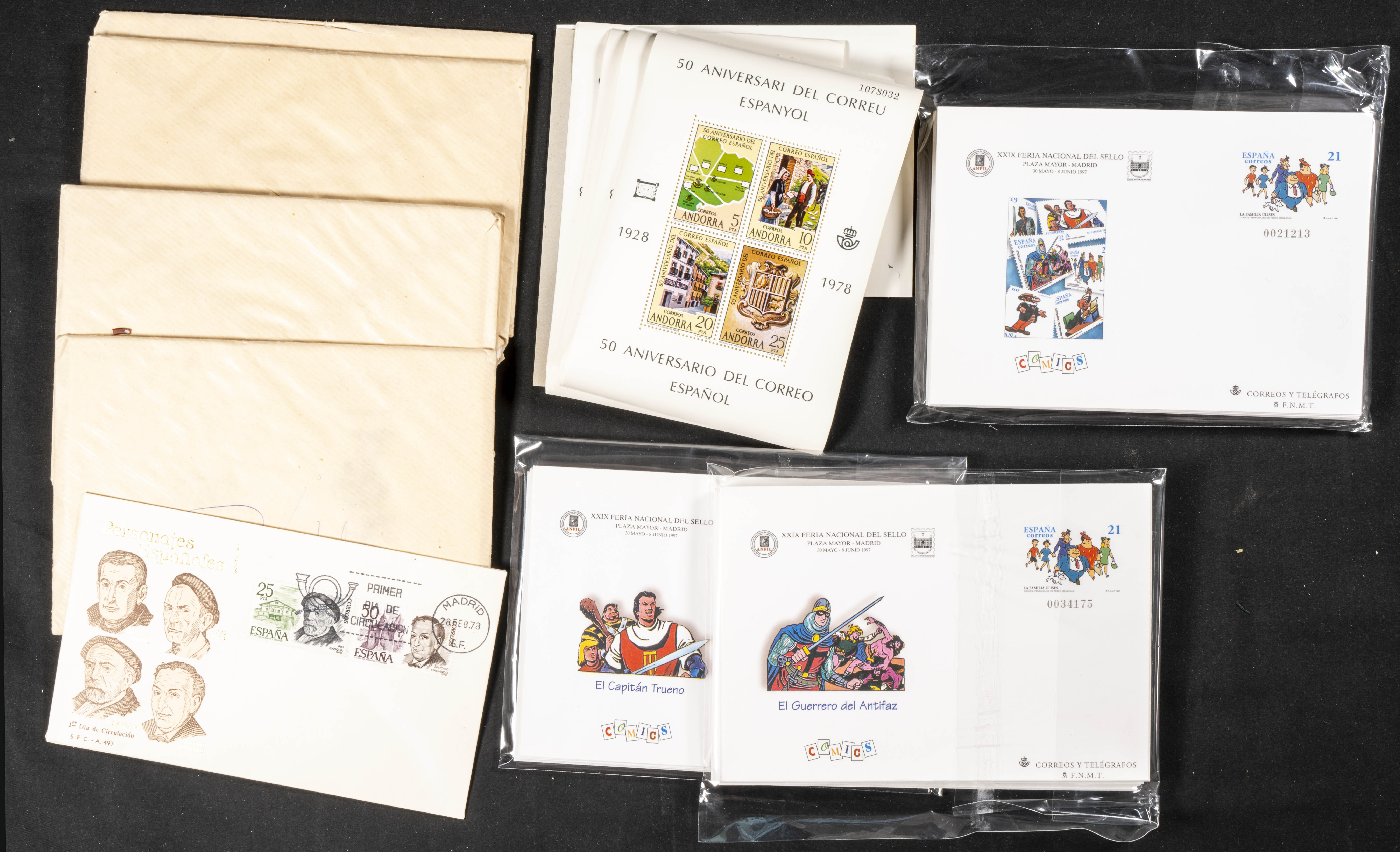 English ★★/(1980ca). Set of more than one hundred philatelic documents, several hundred new and used stamps from Spain and Andorra (the latter new, largely in euros) and modern postcards, includes five mini-sheets of Caballos Cartujanos, several dozen Entero Postales envelopes from 1997 ( comics), Spanish and foreign banknotes, various coins and medals, some in silver. TO EXAMINE.