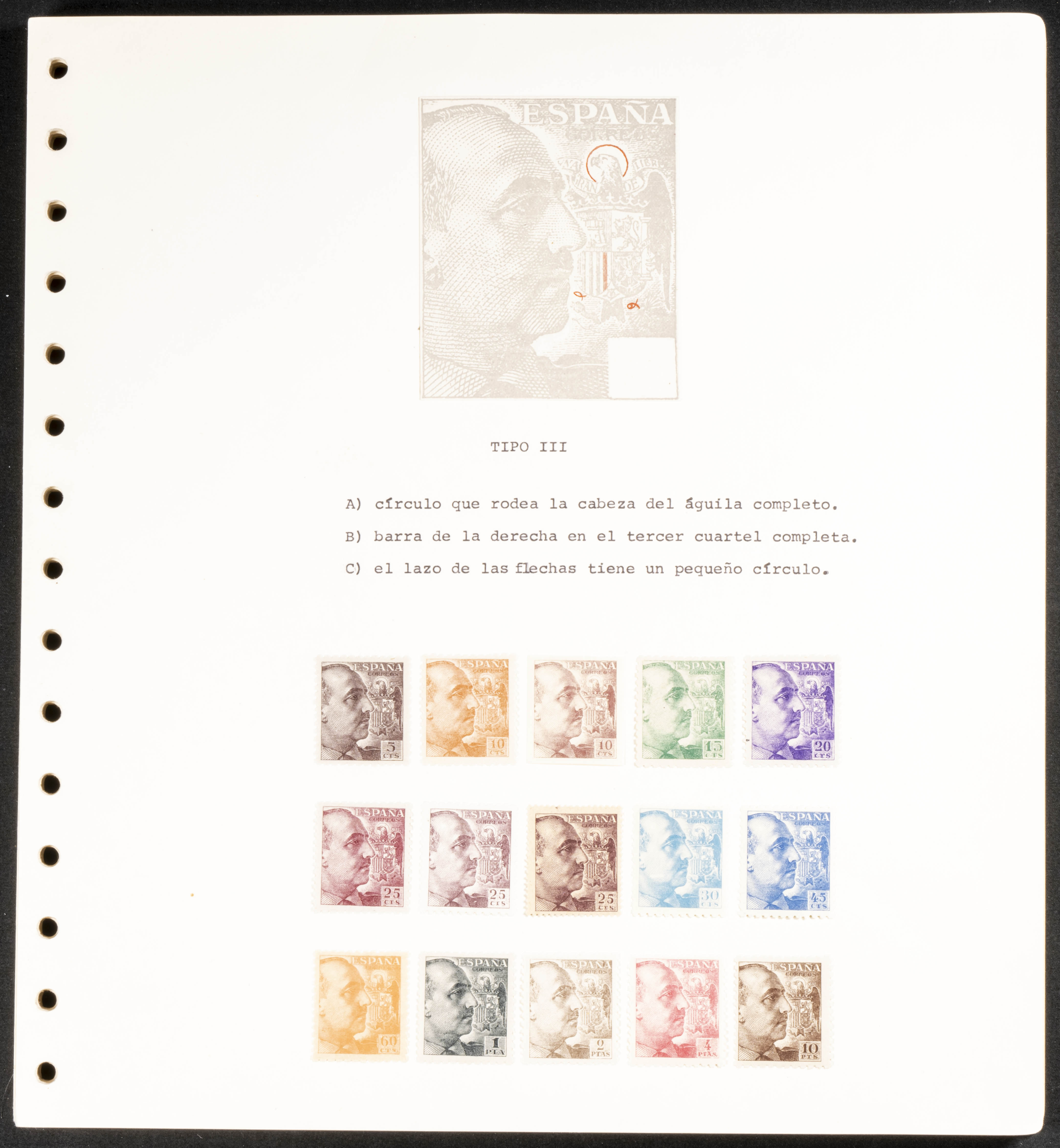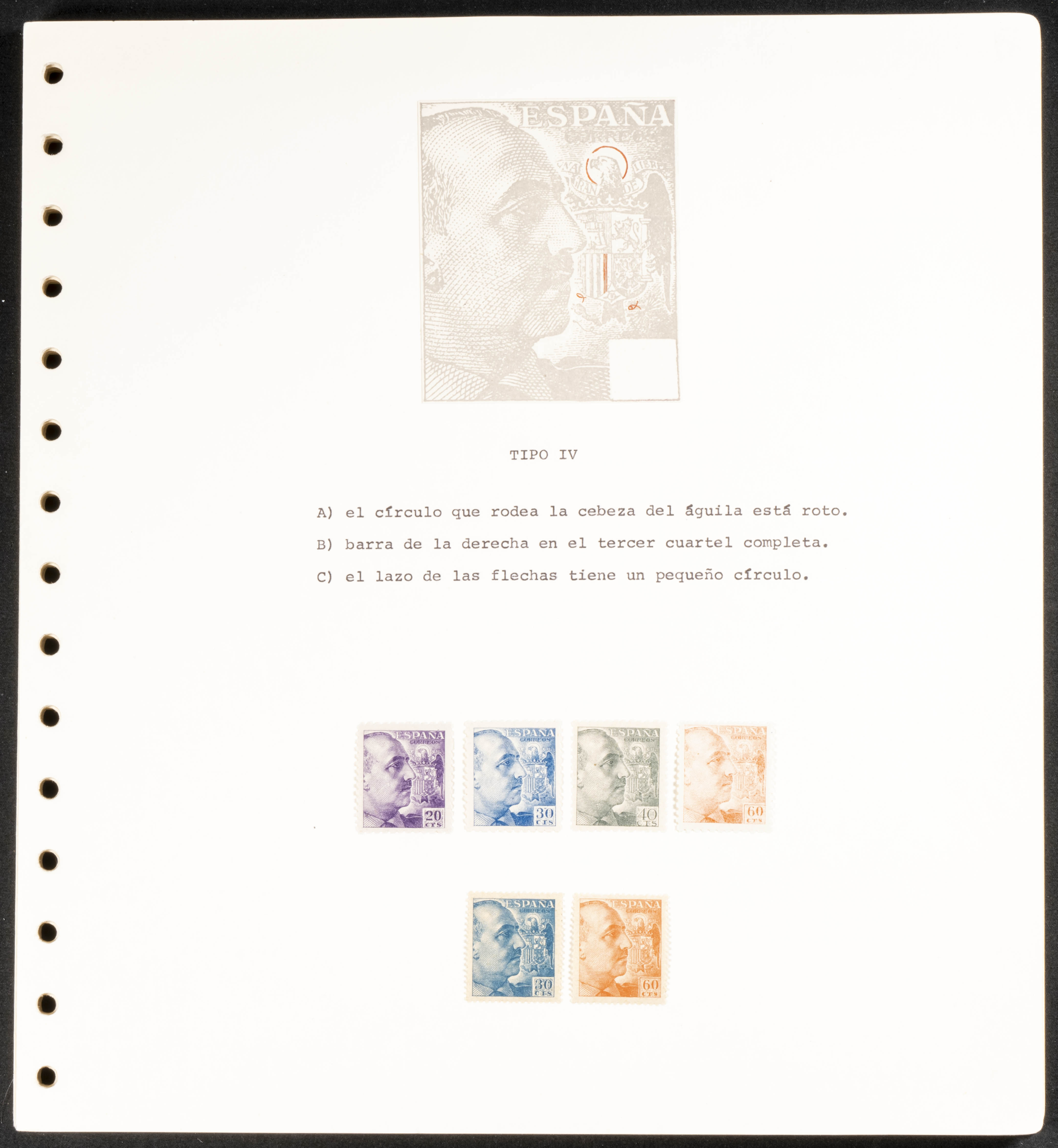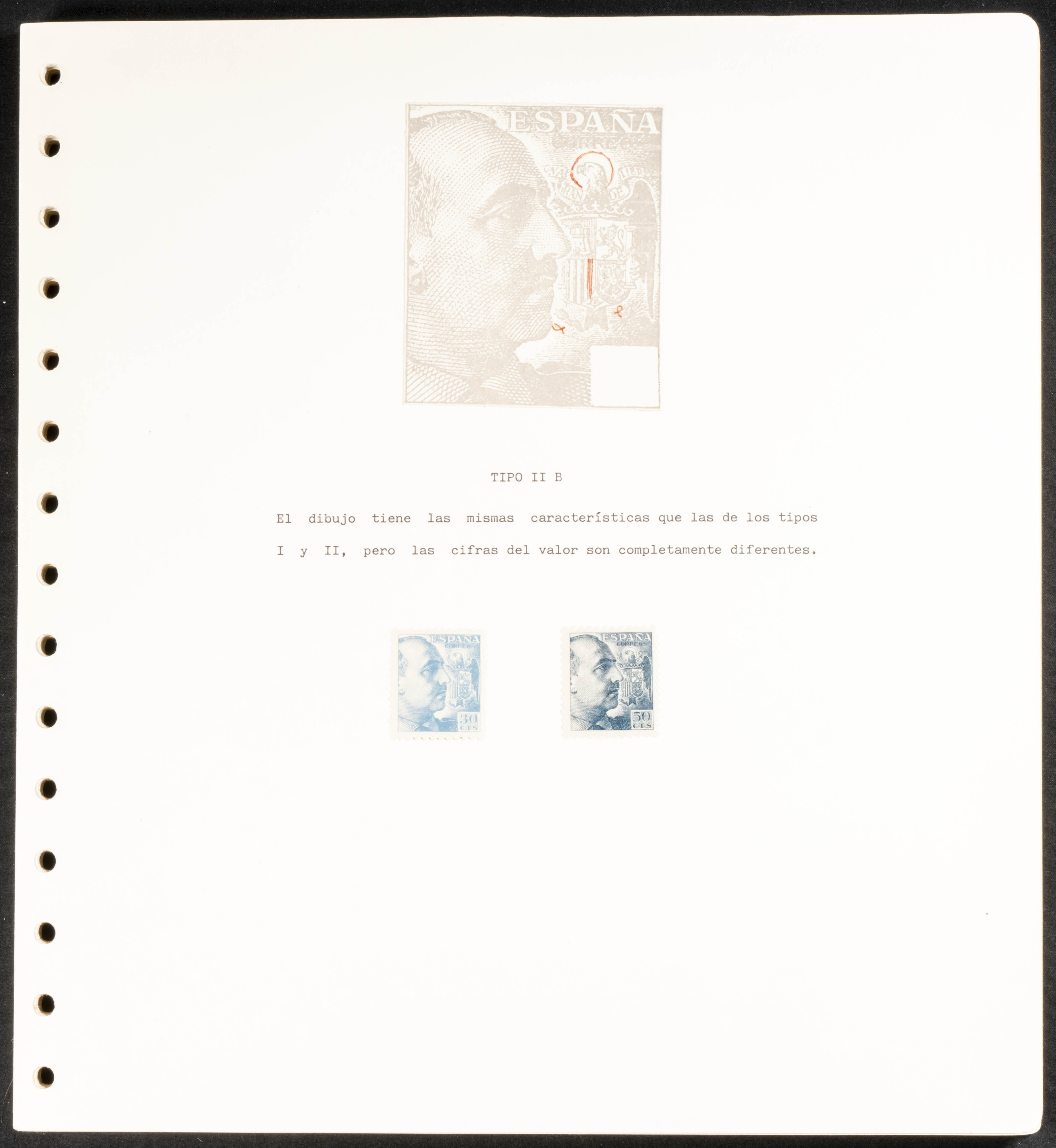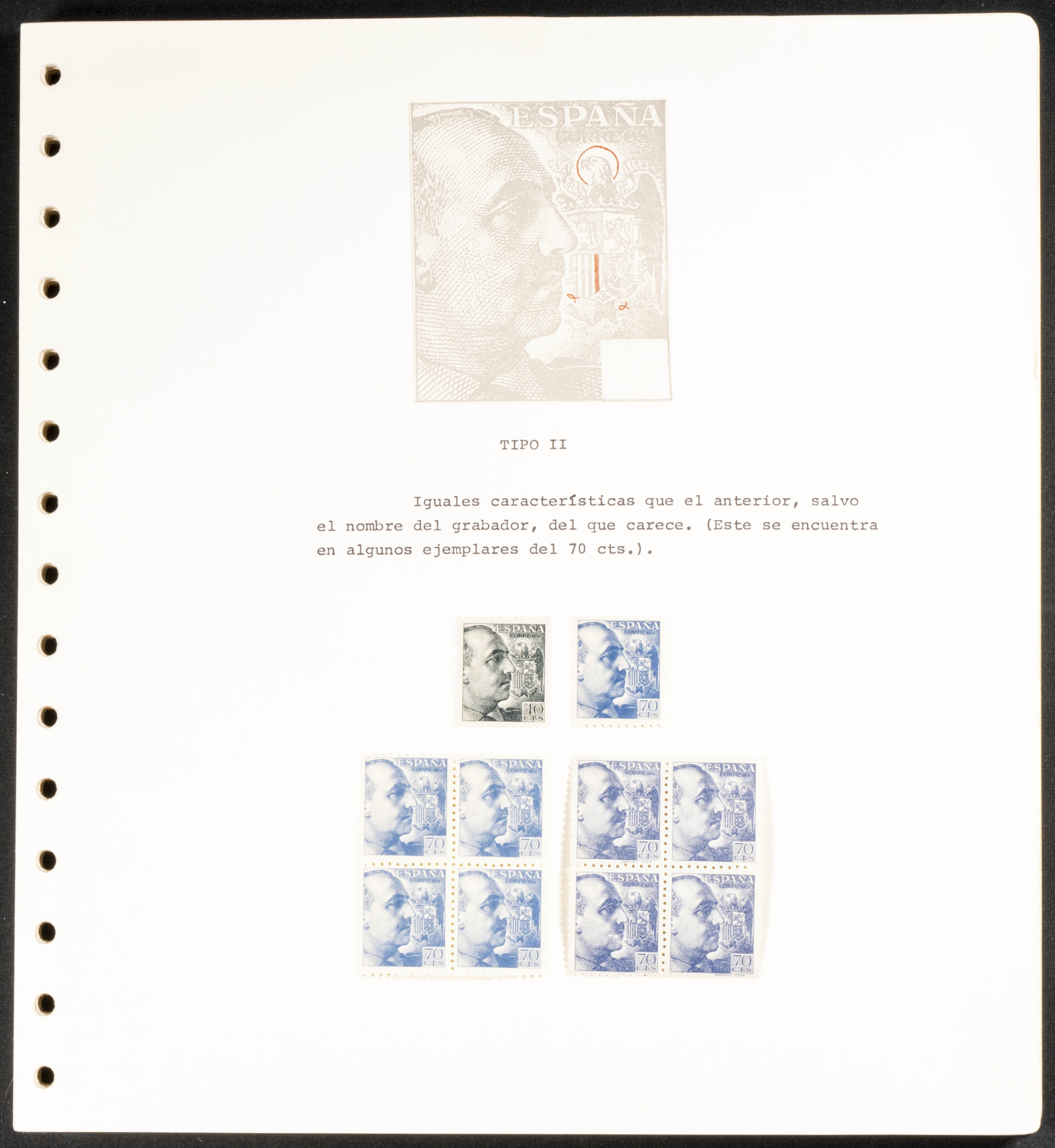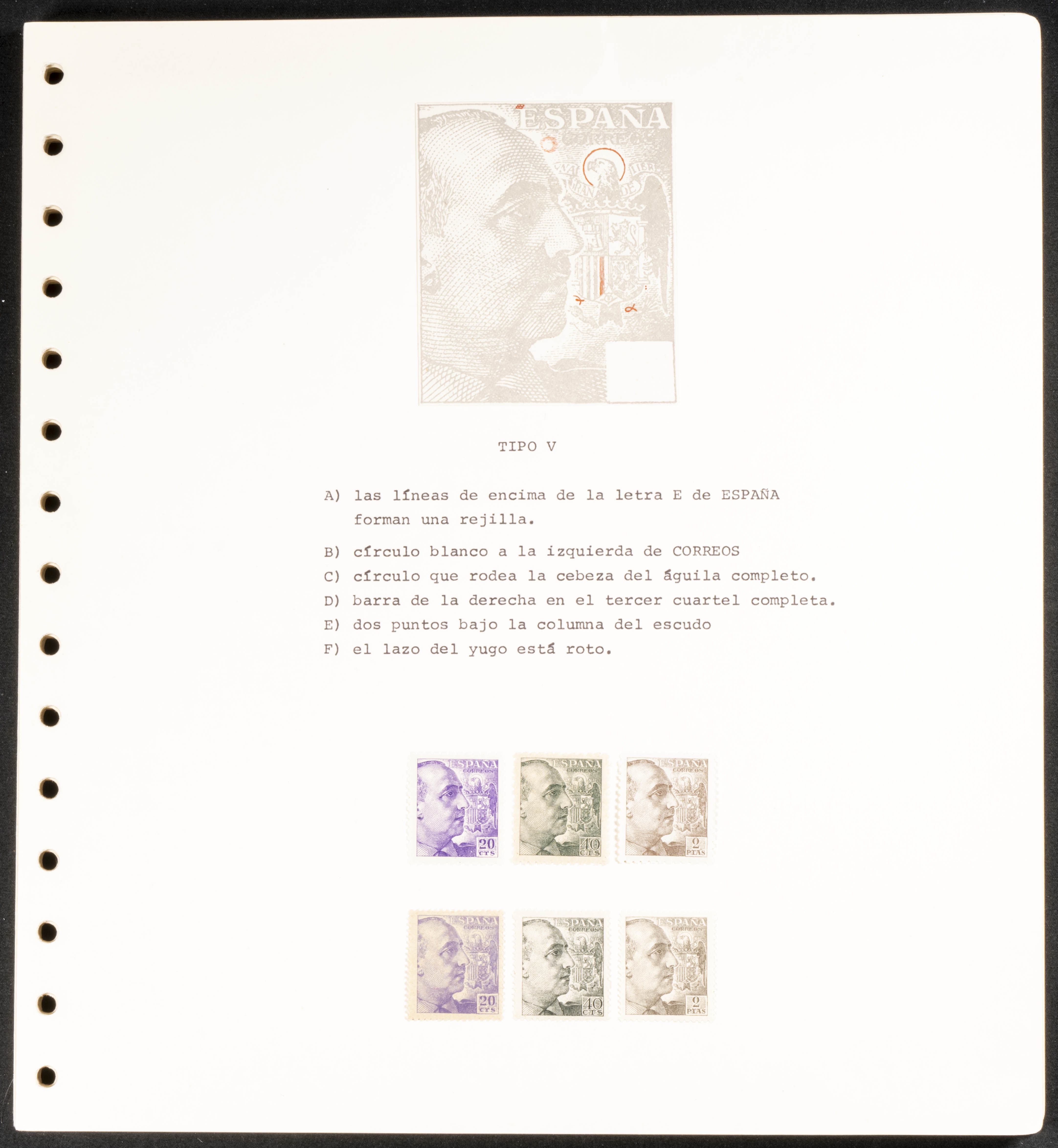 English ★/(1939ca). Spectacular remainder of the collection of new (most) and used stamps from Franco's 1939 and 1949 issues (coarse and fine perforations) with various varieties of cliché, organized by value and indicating each variety or printing defect, includes a study of the report block as well as printing varieties and retouches, this is the compilation made by Francisco Aracil over the years of his life, includes two particular clichés made to photographically document the study. ESSENTIAL TO EXAMINE.
