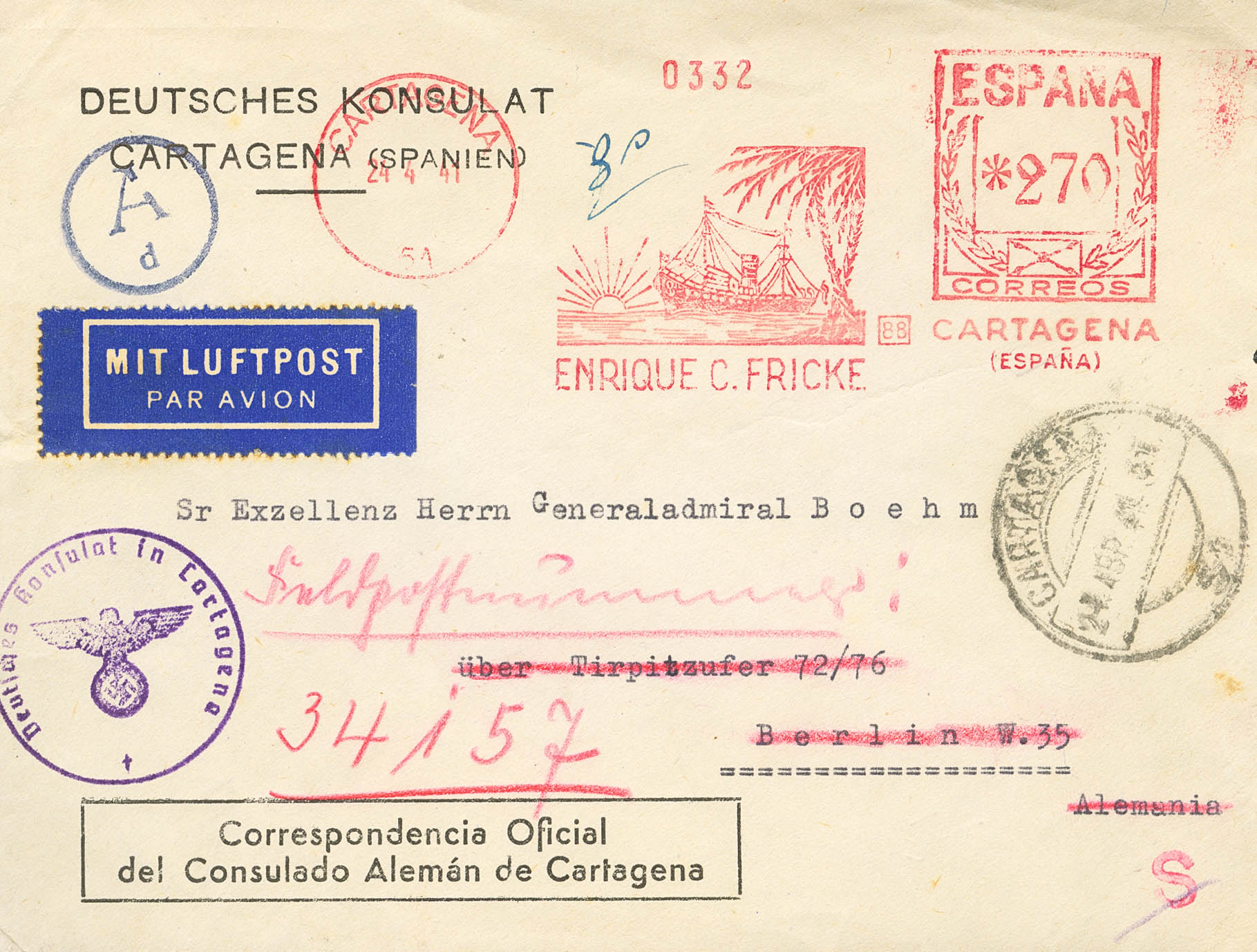 1941. 2´70 pts. ENRIQUE C.FRICKE advertising postage. CARTAGENA to BERLIN (GERMANY), addressed to Admiral Boehm, Admiral Commander of Norway during the German occupation (Feldpost 34157, assigned to the Admiralty). MAGNIFICENT AND RARE.
