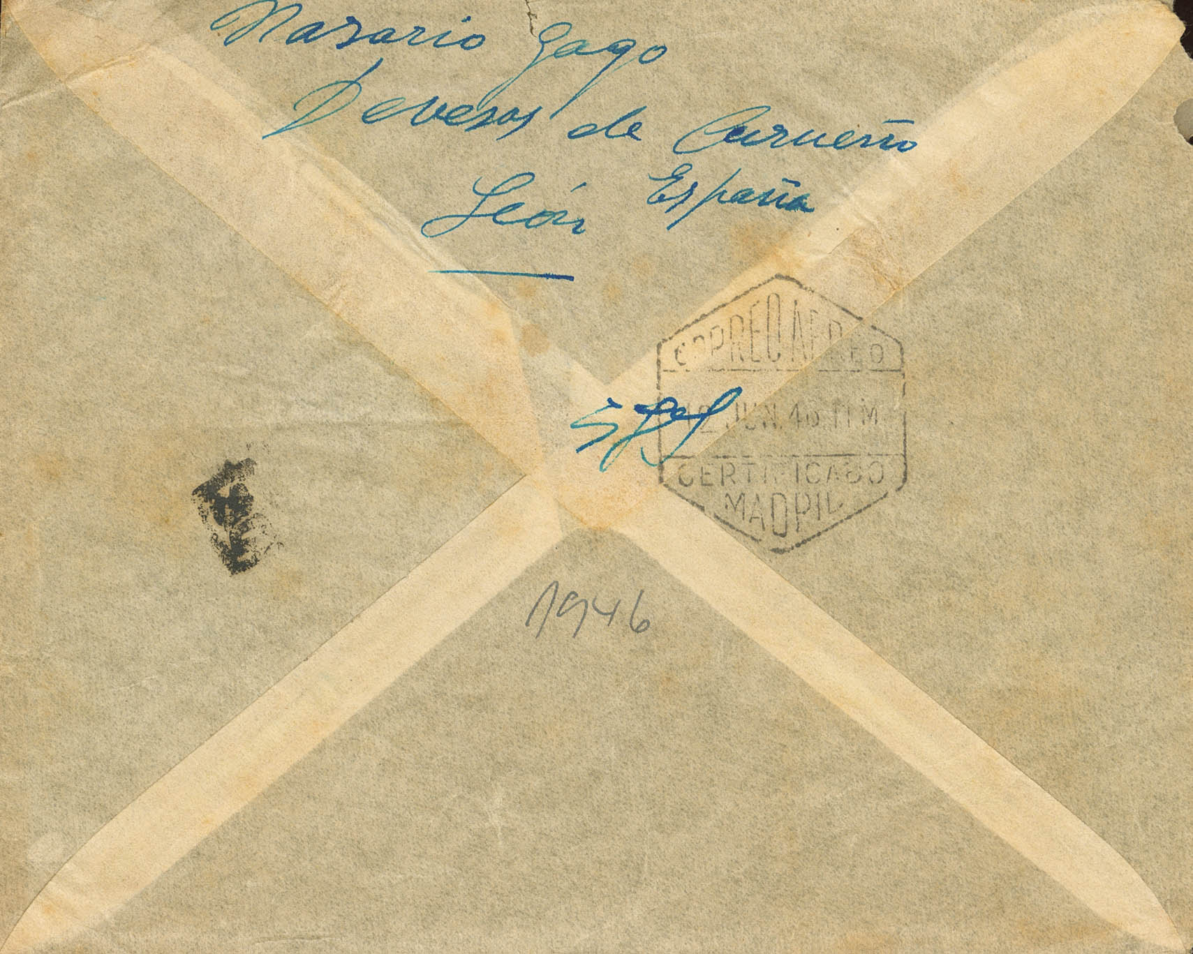 |ENVELOPE| 991. 1945. 4 pts red. Certificate from LEON to SANTA FE (ARGENTINA). Transit on the back. MAGNIFICENT.