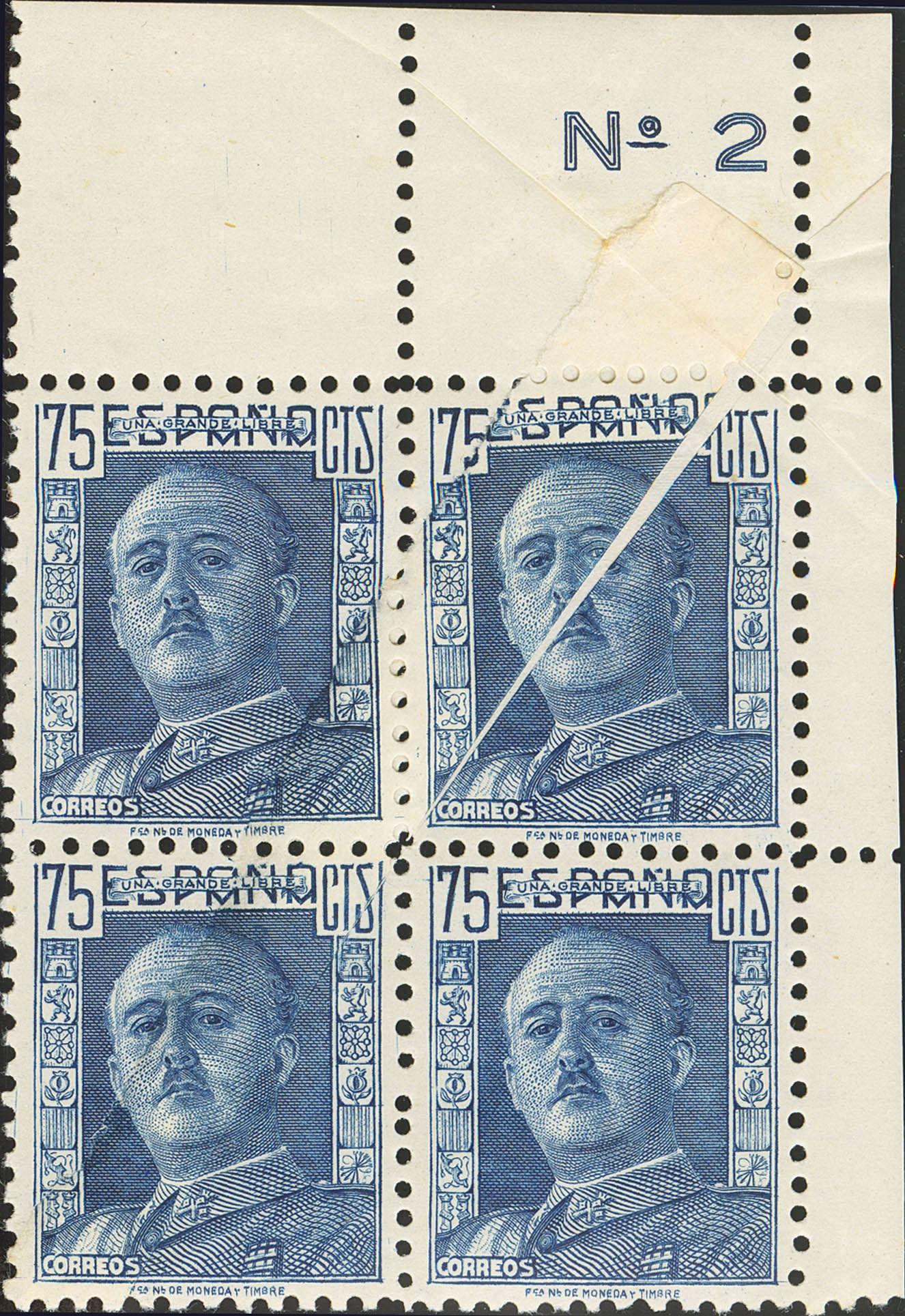 ★★ 999(4). 1948. 75 cts azul, bloque de cuatro, esquina de pliego. Espectacular variedad por INCLUSION DE PAPEL. MAGNIFICO Y RARISIMO.