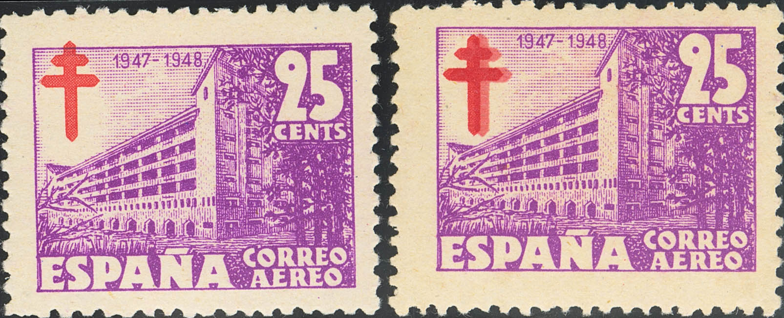 ★★/★ 1019ed, 1019id. 1947. 25 cts lila, dos sellos. Cruz de Lorena DESPLAZADA y DOBLE IMPRESION. MAGNIFICOS. Edifil 2021: 87,5 Euros