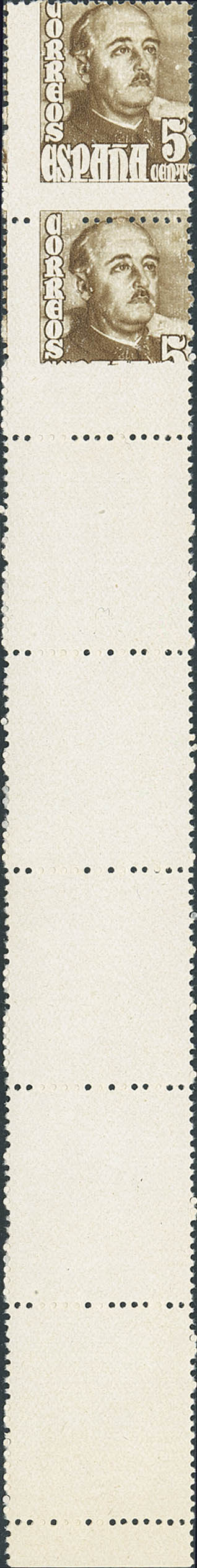 ★★ 1020(7). 1948. 5 cts brown, strip of seven. One stamp PARTIAL IMPRESSION and five stamps WITHOUT FULL IMPRESSION. MAGNIFICENT.