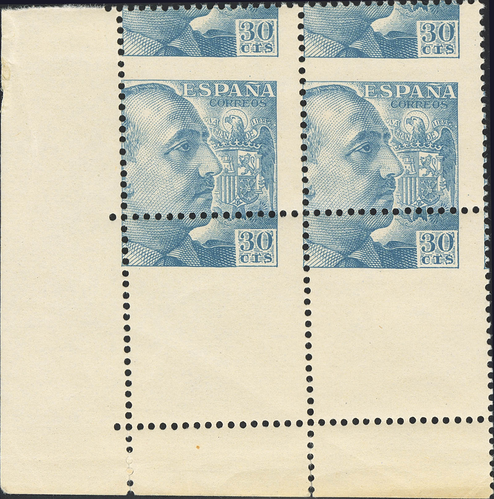 ★★ 1049(4), 1049dh(4). 1949. 30 cts azul, bloque de cuatro, esquina de pliego. DENTADO HORIZONTAL DESPLAZADO. MAGNIFICO Y RARO.
