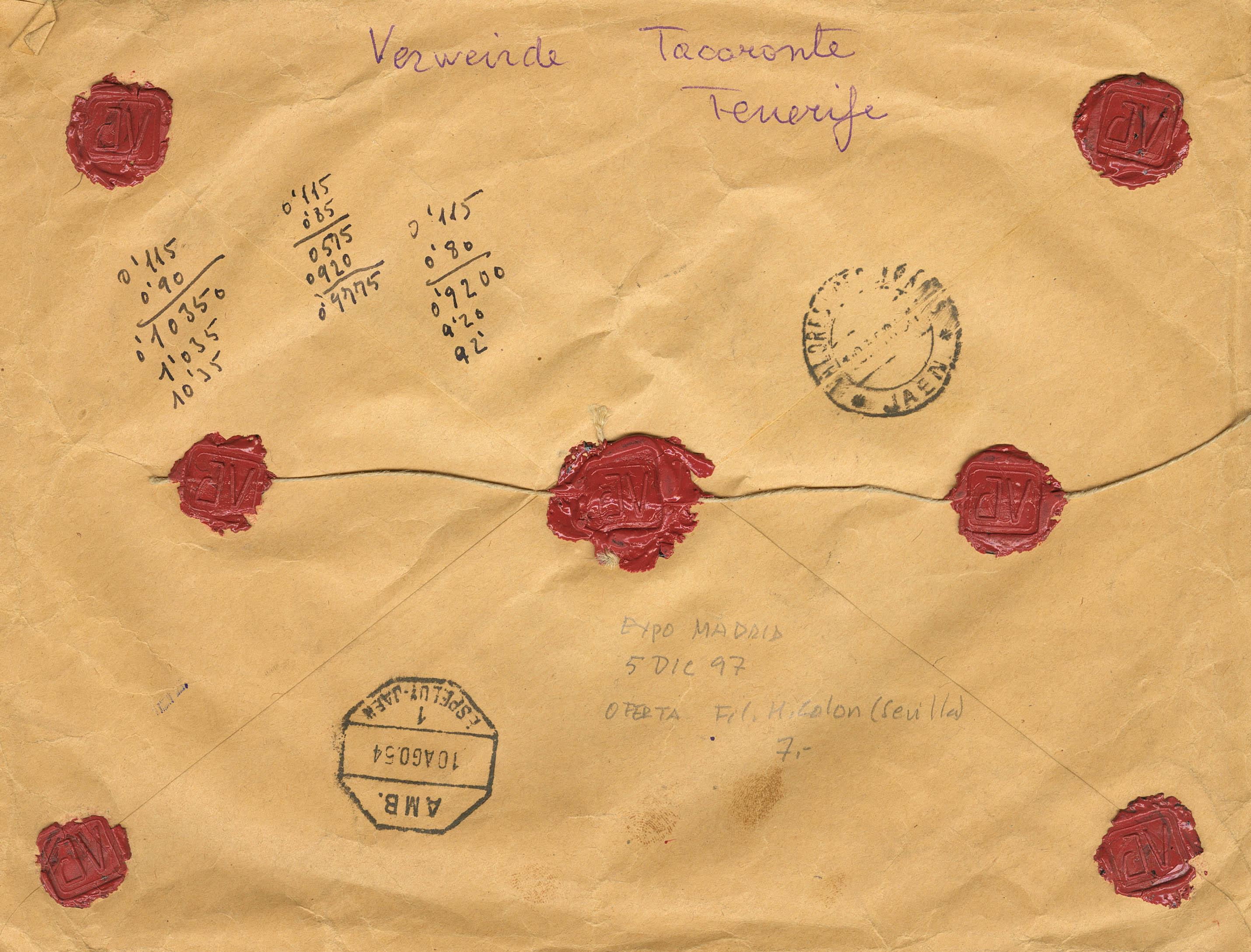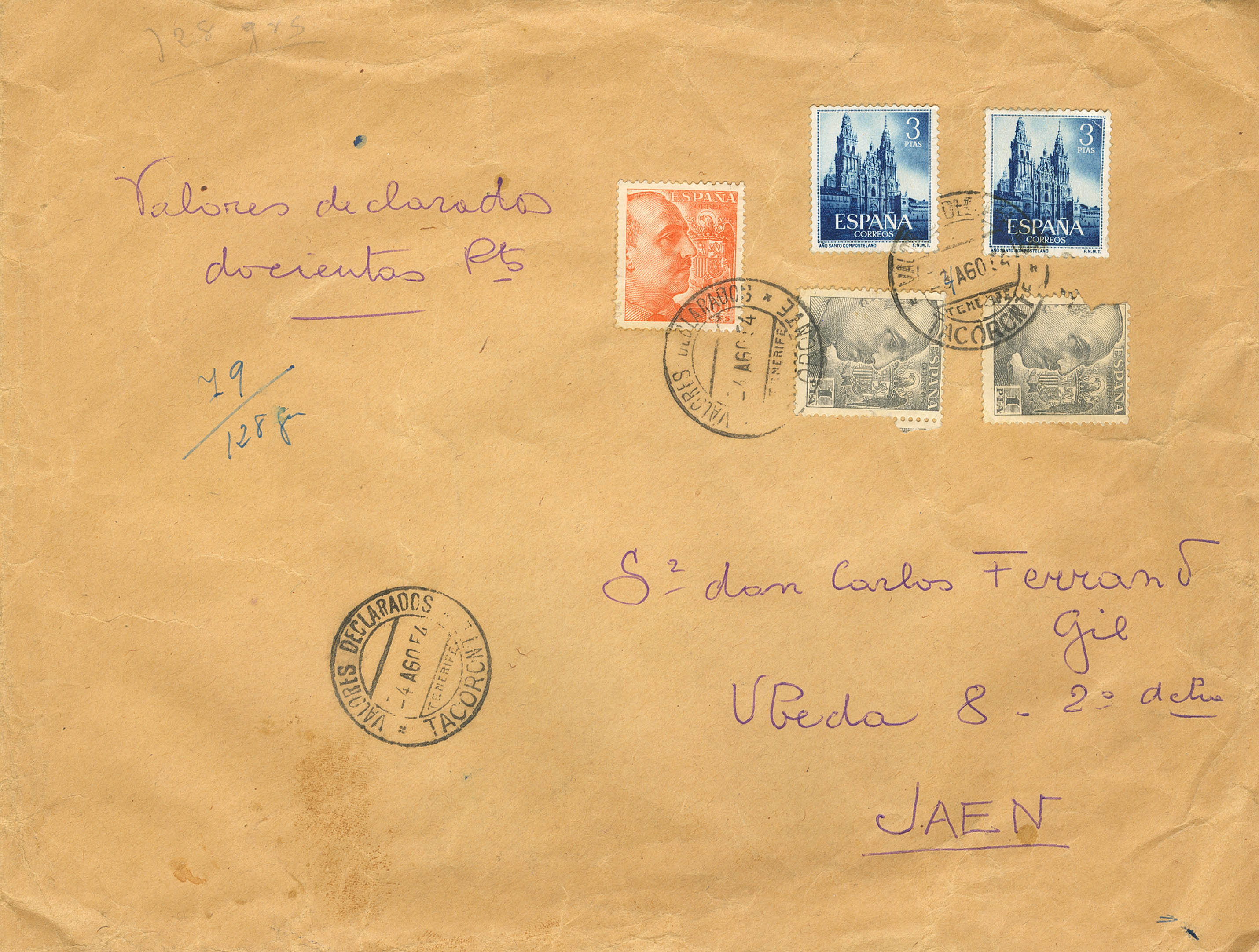 1131(2). 1954. 3 pts azul, dos sellos y diversos valores. Valores Declarados de TARACONTE (SANTA CRUZ DE TENERIFE) a JAEN. Al dorso de llegada. MAGNIFICA.