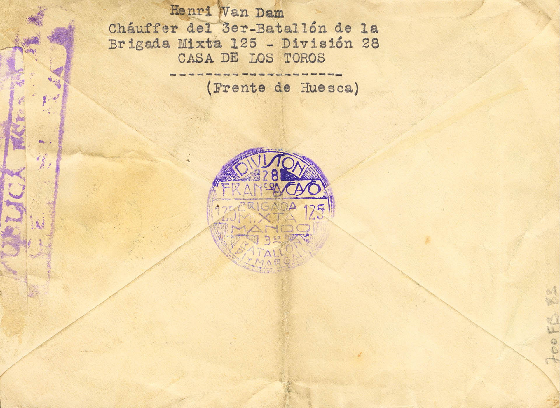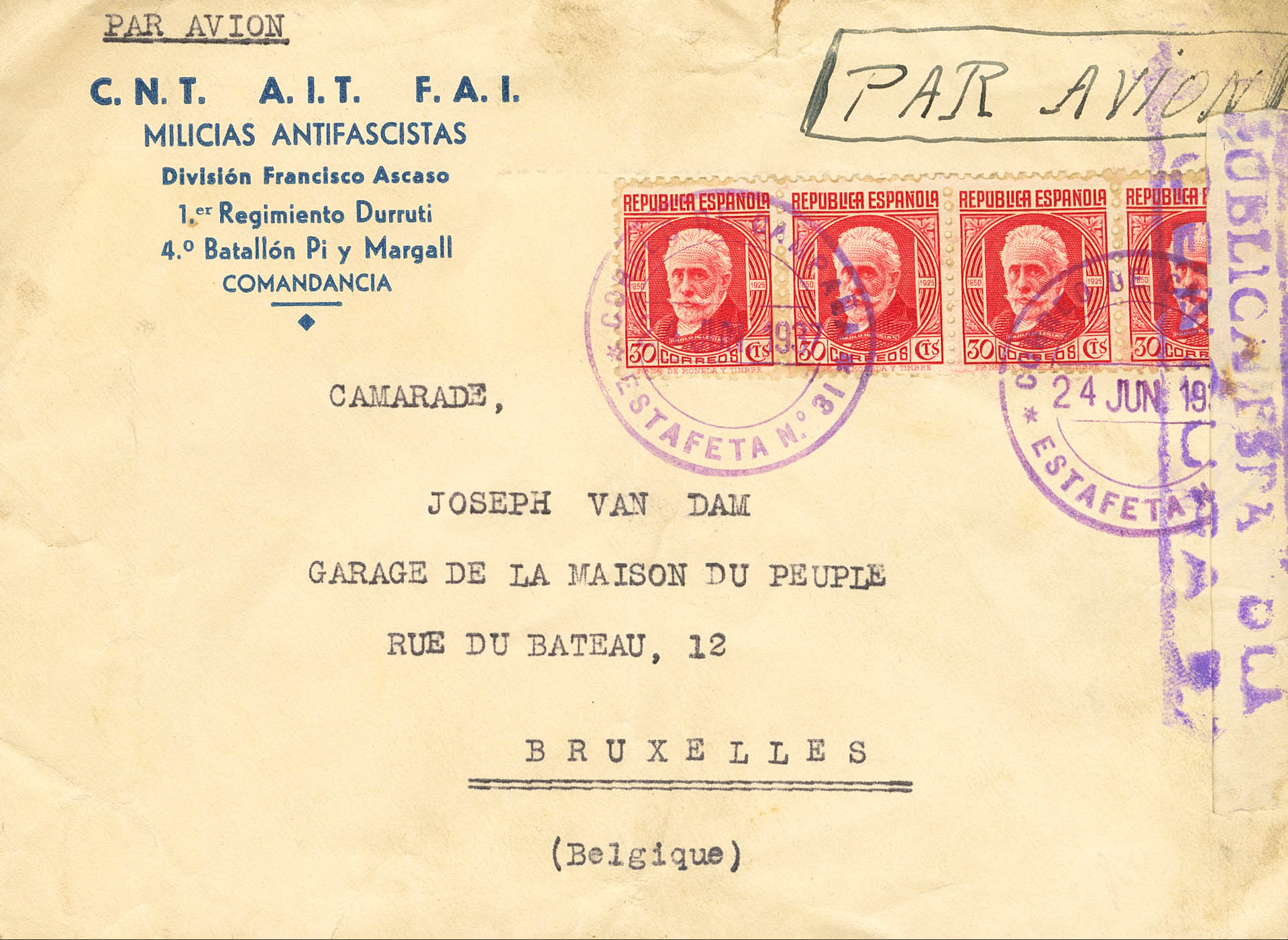 |ENVELOPE| 735(4). 1937. 30 cts red, strip of four. Envelope from CNT / FAI from HUEUncirculatedA to BRUSSELS (BELGIUM). Postmark CAMPAIGN MAIL / ESTAFETA Nº31, in violet and on the back mark DIVISION / 28 / FRANCº AUncirculatedASO / 125 MIXED BRIGADE / COMMAND / 3rd / BATTALION / PI Y MARGALL, in violet. MAGNIFICENT AND RARE.